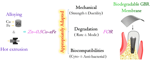 Replacement of tooth loss is increasingly implemented nowadays. Dental implants serve as benchmark for this clinical practice. However, commonly insufficient bone volume at implantation site, caused usually by trauma, tumors and periodontal diseases, hinders largely the efficacy of implants. Guided bone regeneration (GBR) is typically demanded in such case to assist the dental implants. Whereas, current GBR membranes are made of non-degradable metallic biomaterials and are still far from satisfactory. A degradable hot-extruded Zn-Cu-Fe alloy with appropriate comprehensive properties has been fabricated by Prof. Guojiang Wan’s group for GBR membrane application, which has been recently published on academic journal Bioactive Materials. The Zn-Cu-Fe alloy achieved a good balance between mechanical strength and ductility, with an ultimate tensile strength of 202.3 MPa and elongation at fracture of 41.2%. Meanwhile, this alloy showed relatively uniform degradation/corrosion mode in the long-term immersion test. Moreover, the Zn-Cu-Fe alloy exhibited no apparent cytotoxic effects against L929 fibroblasts, Saos-2 osteoblasts or TAg periosteal cells; Likewise, this alloy showed antibacterial effect against both Streptococcus gordonii and mixed oral bacteria. Our study verified that the Zn-Cu-Fe alloy could bode well for GBR membrane application.