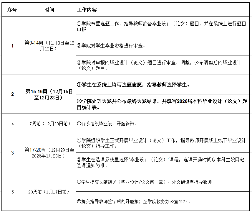 各系请于2025年12月11日(第14周周四)前围绕2026届本科毕业设计(论文)工作开展教研活动,并填写教研活动记录表(见附件2)。