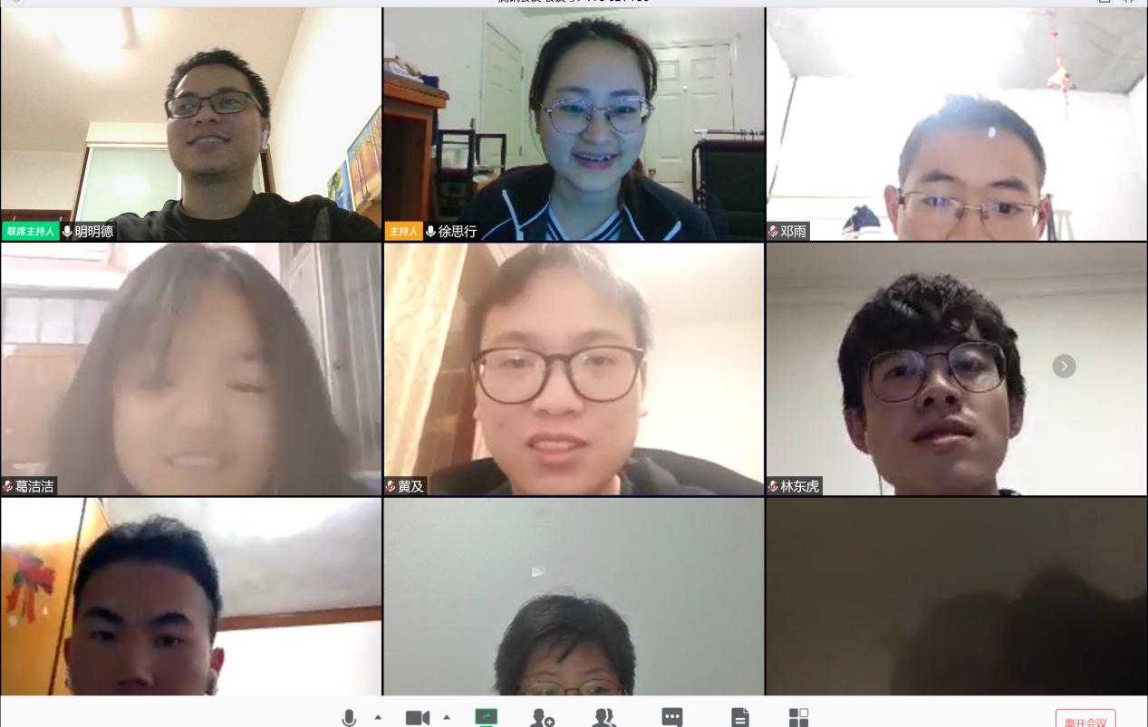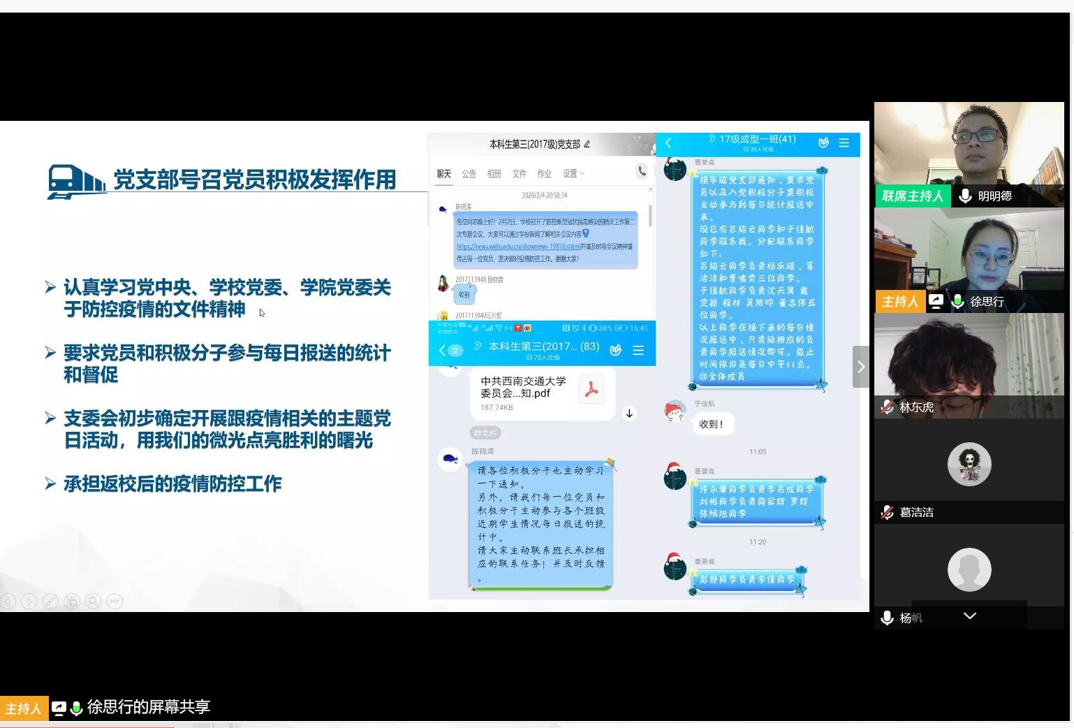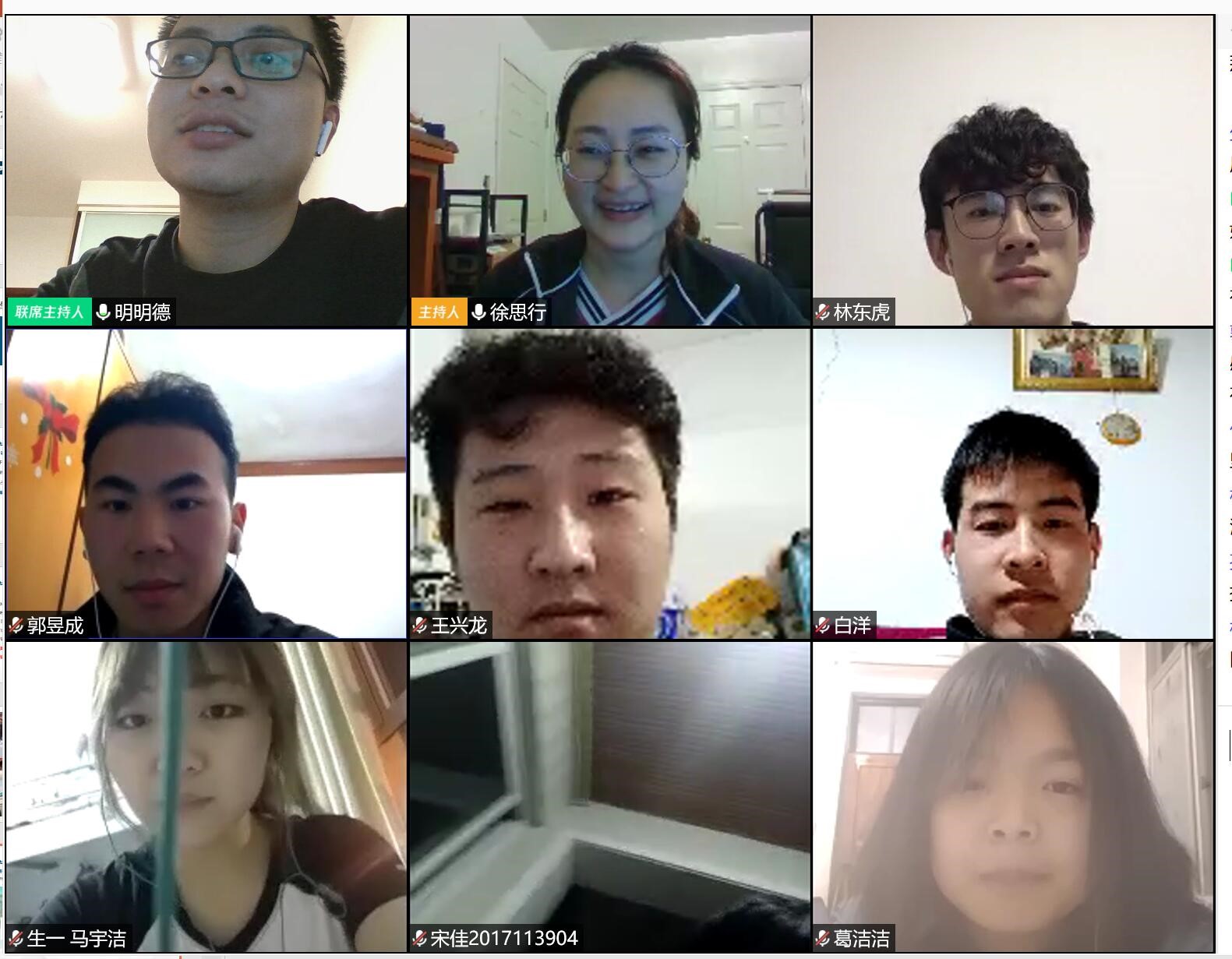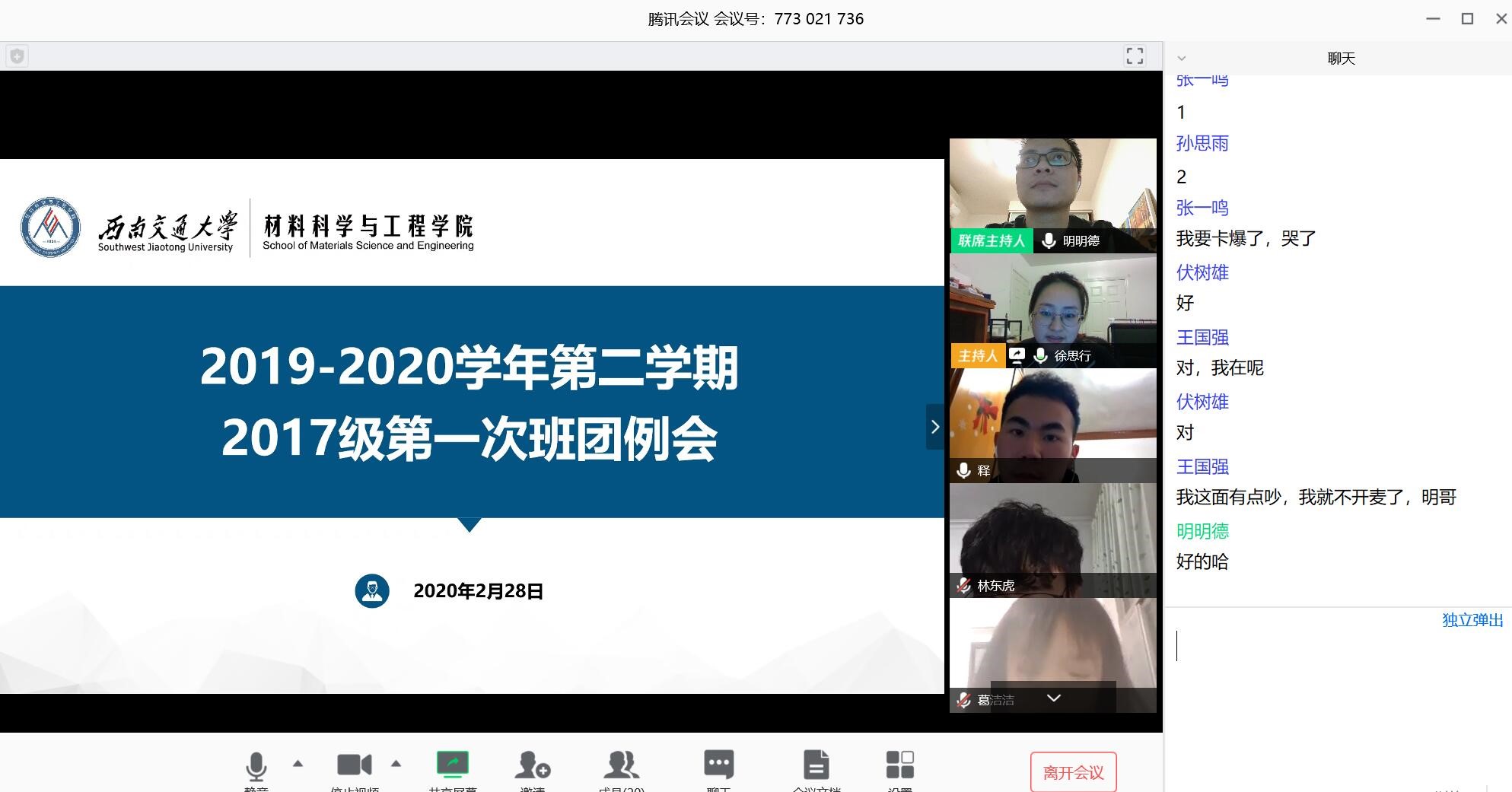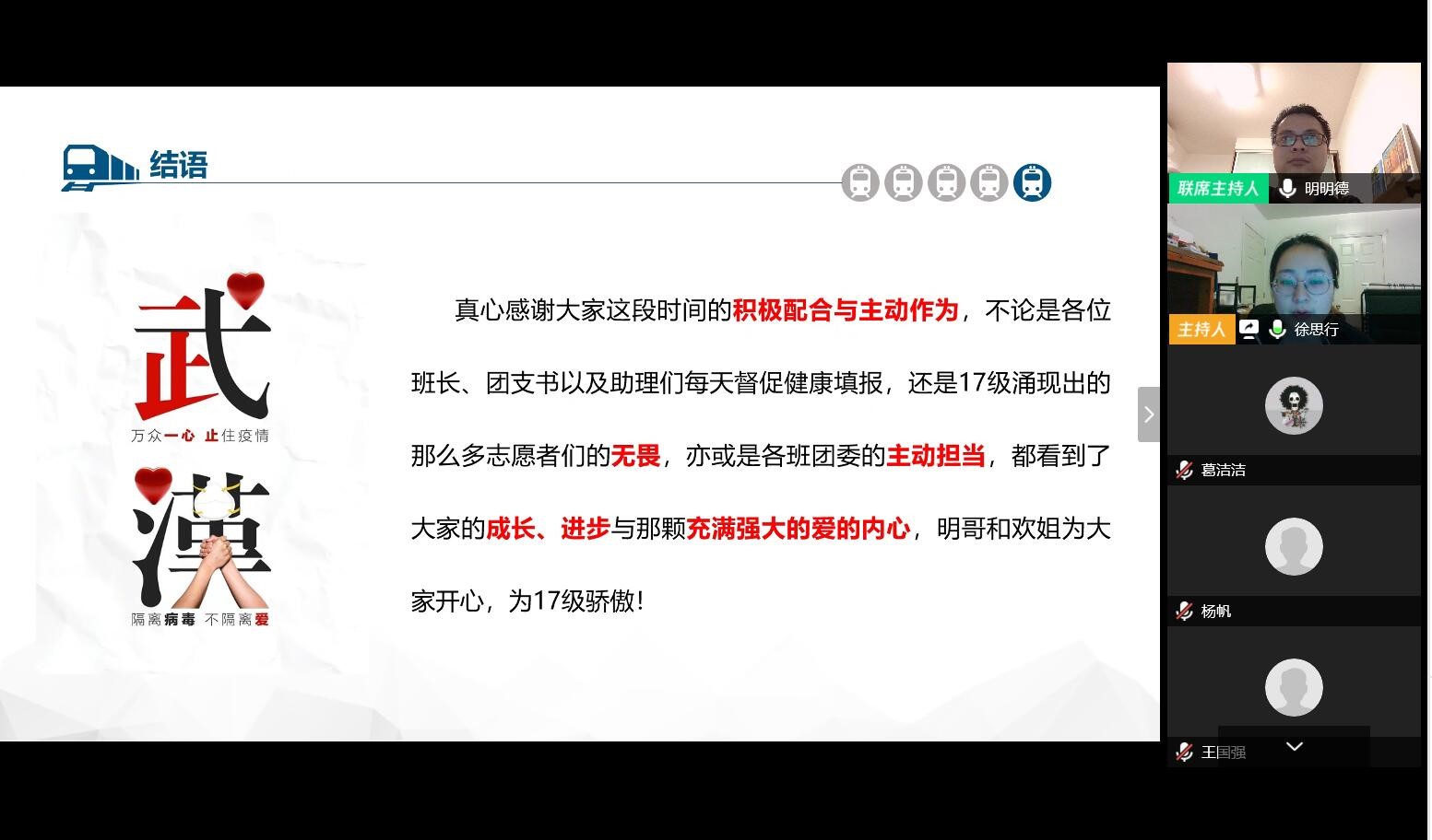 2020年2月28日20:30,太阳集团tyc1512017级线上班团例会顺利召开,辅导员黄德明老师、许欢老师与班长、团支书们第一次以这种特殊的方式“以情话疫”。
