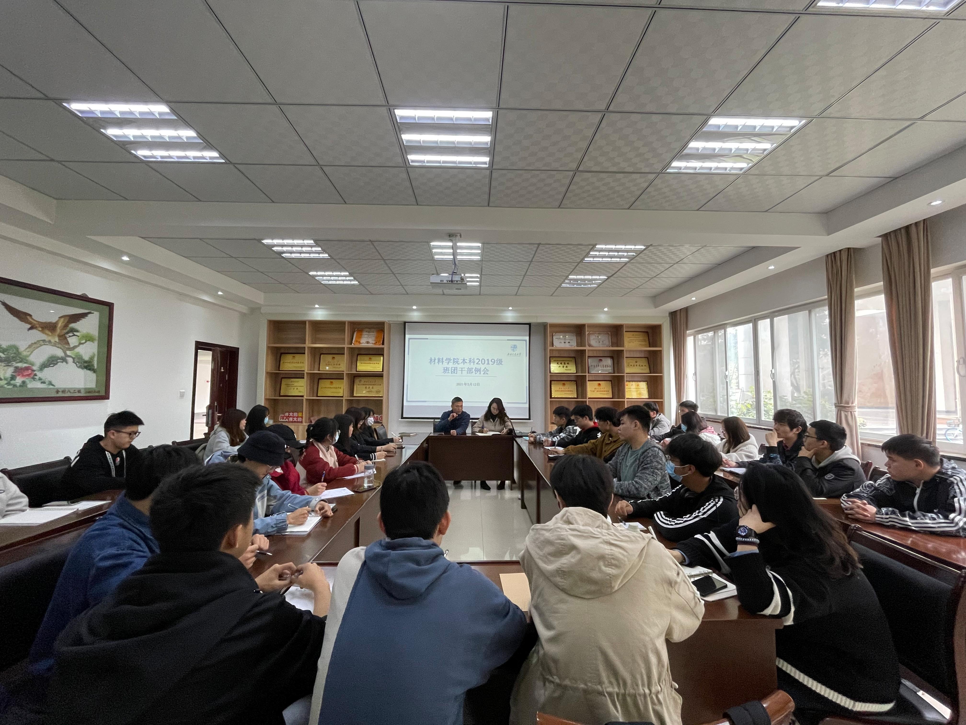 2021年3月12日下午1点,太阳集团tyc151在X2128开展了2020-2021学年第二学期第一次班团干部例会,参会人员有公司党委副书记章春军,辅导员熊苏雅、肖俊怡及2019级各班班长、团支书和学习委员。