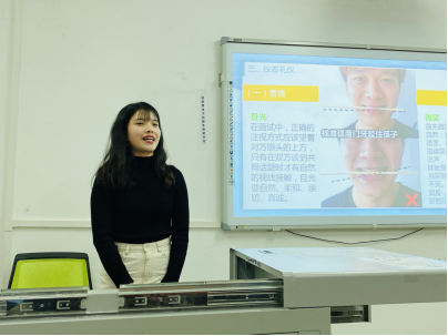 陈齐芊主要从面试礼仪、日常交往礼仪讲解,通过讲解图片案例,与参训人员分享了仪容礼仪、仪态礼仪、手势礼仪以及会见礼仪等相关知识,同时分析了站、立、行、走、坐等不同的礼仪规范。