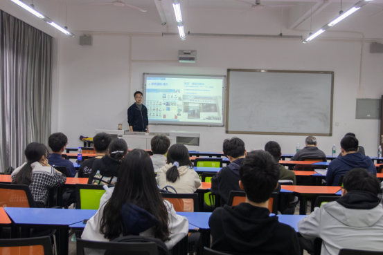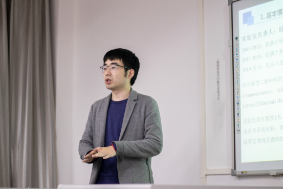 最后,由李中教授上台为大家介绍纳米功能材料与传感系统实验室。李教授在介绍了实验室的一些基本情况之后,指出了实验室目前的研究方向——气体传感和电化学检测。李教授告诉同学们,说到气体传感,要想让传感性能更优异,就要研究更强大的气体传感器。所以实验室就是在努力研发性能更优良的气体传感器。