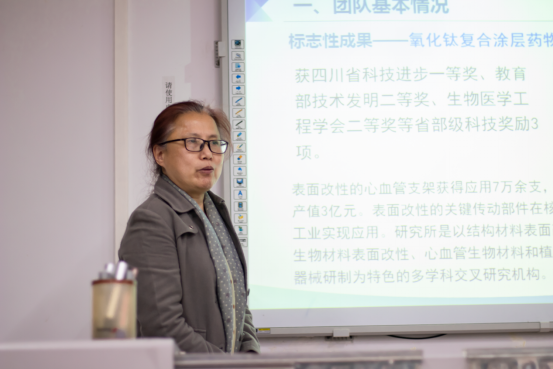 第三位上台的是杨苹教授,杨教授的研究方向是心血管生物材料表面工程。据杨教授介绍,她们的研究团队已成立三十年,获得了很多科研成就,其中标志性的成果就是氧化钛复合涂层药物洗脱支架。杨教授用图像清晰地向大家展示了团队的研究思路——仿生构建。