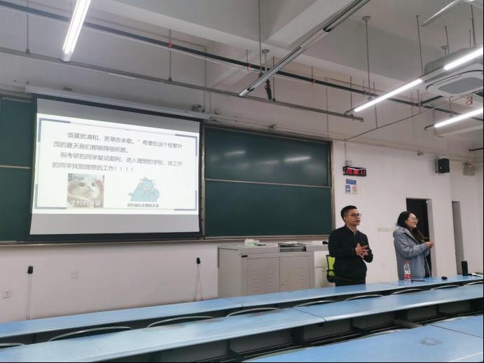 大会第二项,许欢老师就就业、安全和重要信息三方面讲述了相关内容。就业方面,时处春招高峰期,许欢老师提醒同学们把握机会,根据自身情况决策毕业去向,同时提供了一些获取就业信息的方式和途径。两位老师还结合实际事例给同学们提供了一些关于就业去向的建议。安全方面,许欢老师提醒同学们在临近毕业期间不能掉以轻心,并从出行安全、财产安全、宿舍安全、防疫安全及重大传染病防控几个方面讲述了相关注意事项和要求。最后,许欢老师着重提醒同学们关注考研复试的时间和相关通知,提前做好相关准备。此外,两位老师讲述了本校调剂政策、调剂程序和调剂的一些优势,并建议同学们可以合理选择调剂这一途径。