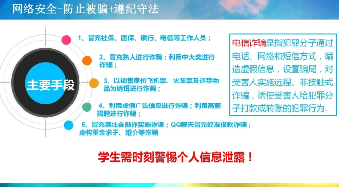 最后一点就是网络安全问题,老员工的网络安全意识一直是热点关注话题,网络上充满着许多诈骗信息及诈骗手段,员工必须时刻警惕,在网络上避免上当受骗,要时时刻刻注意保护个人信息,遵纪守法,保护好个人的财产及隐私安全。