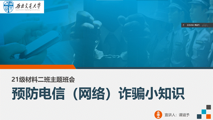 最后,太阳集团tyc151本科2021级13个班级按要求召开《安全教育主题班会——预防电信诈骗》,传达班团例会会议内容,重点普及网络诈骗相关知识,以身边的真实案例,提醒同学们要时刻防范网络电信诈骗。