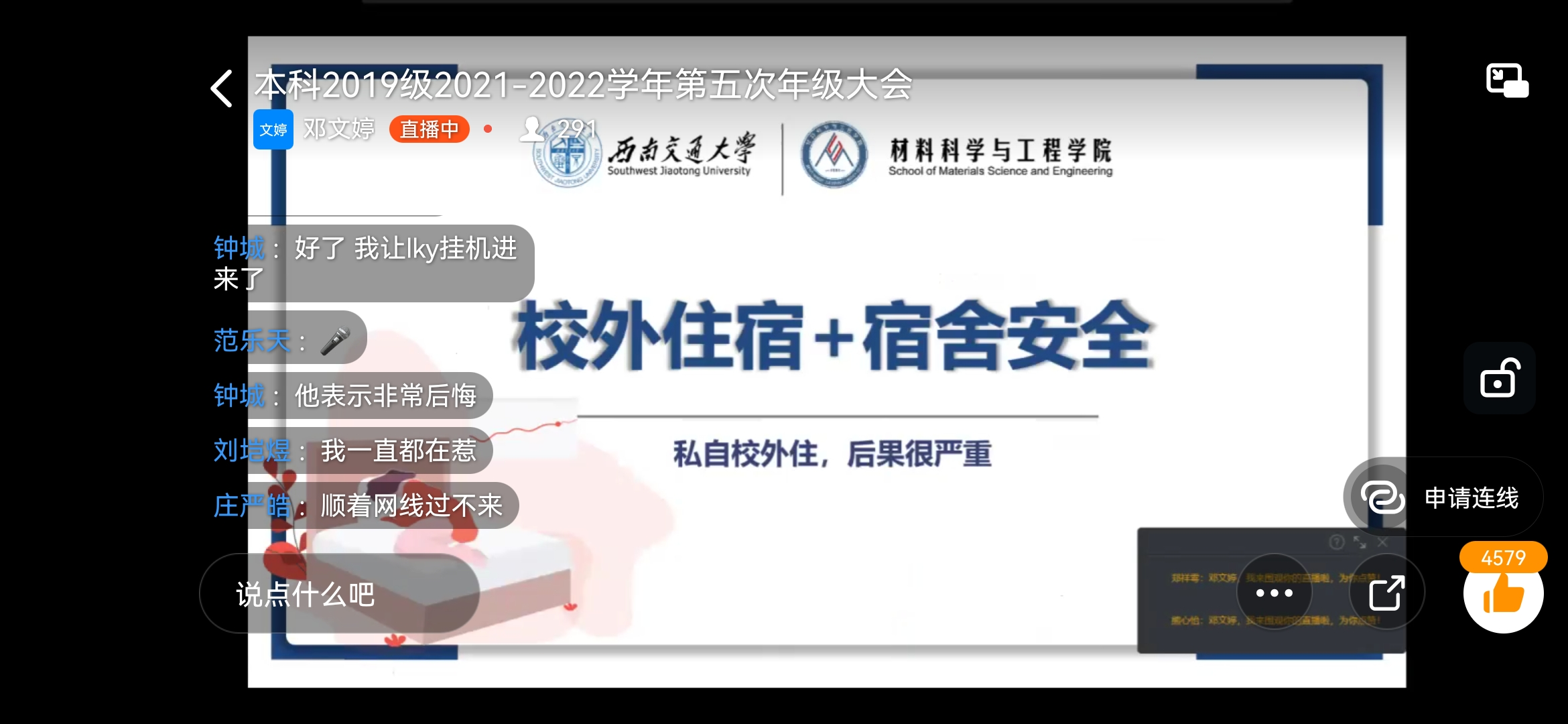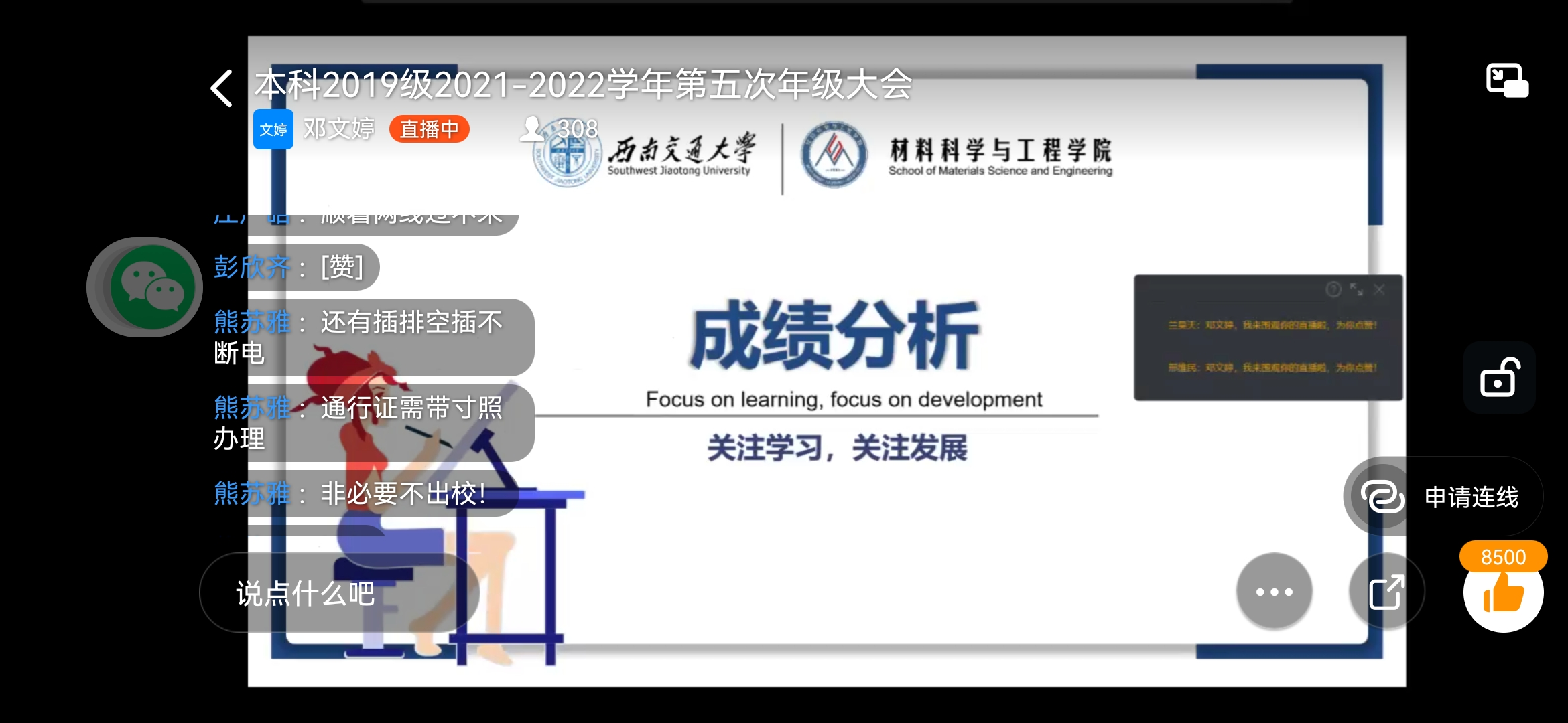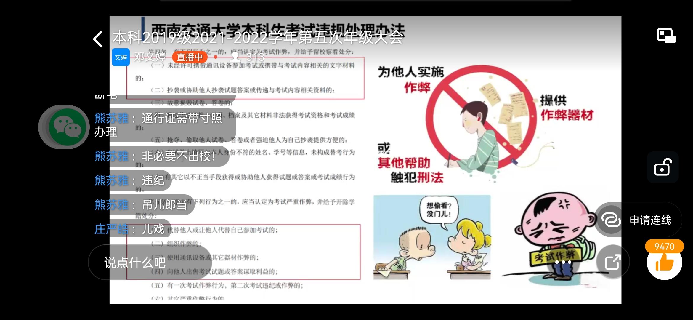 响应公司疫情防控的要求,太阳集团tyc151本科2019级2021-2022学年第五次年级大会聚焦“安全”和“成绩”两个关键词,于2021年11月10日晚21:30在钉钉平台顺利召开。2019级本科全体同学参与大会,2019级辅导员邓文婷、熊苏雅出席并主持。