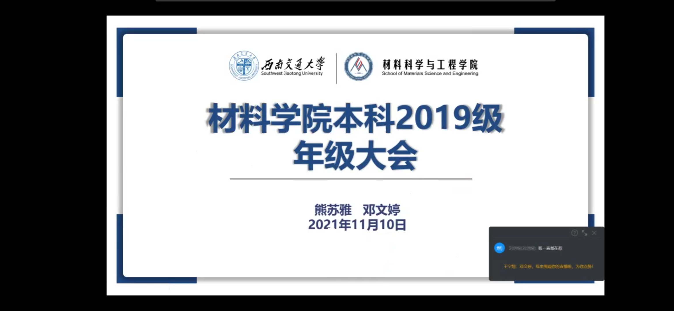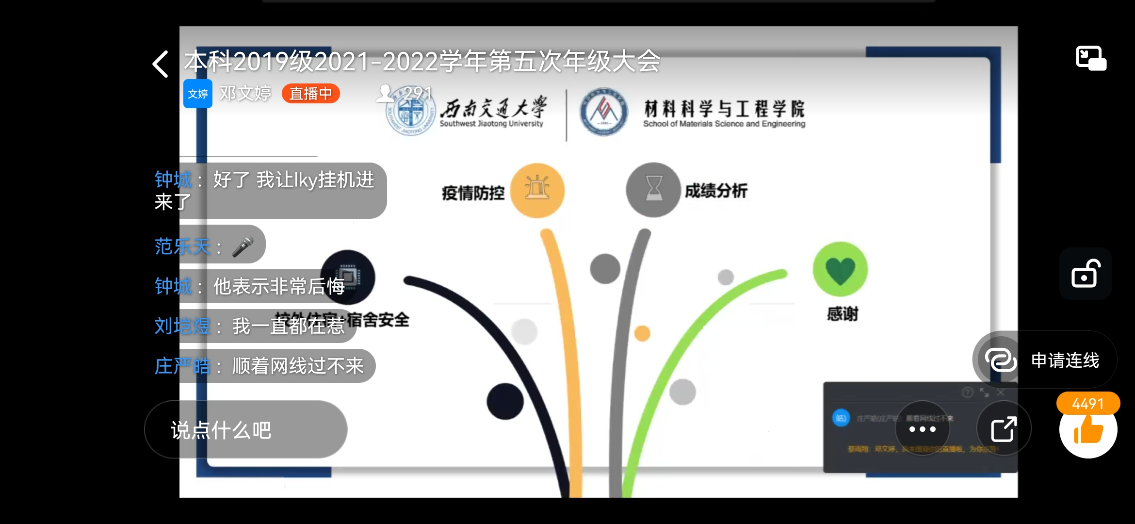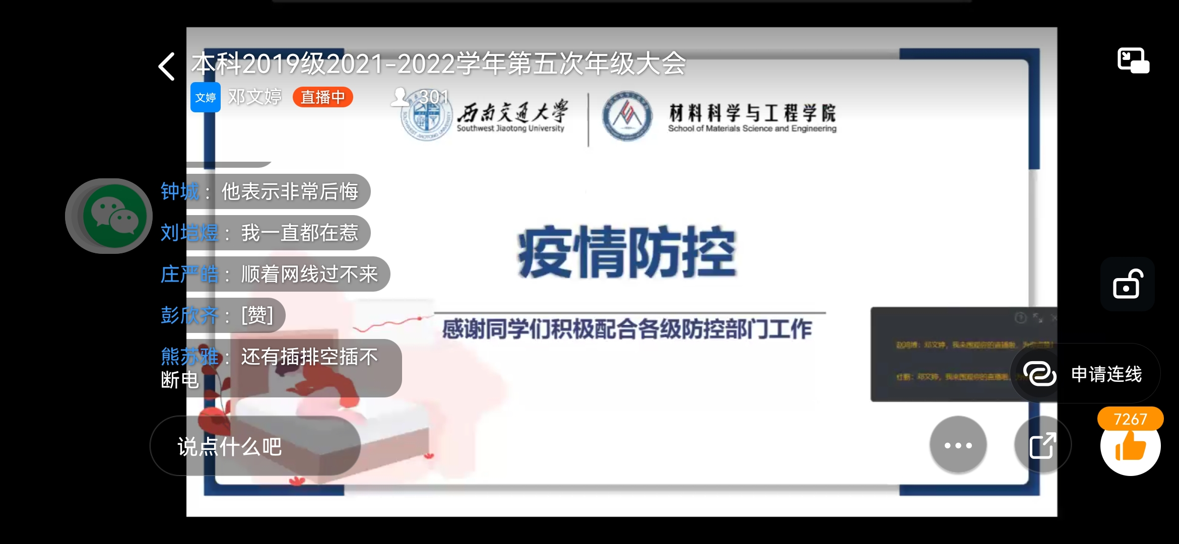最后,熊苏雅再次强调疫情防控事宜,同时提醒同学们关注公司通知以及课程教师的安排,也不要因为“上网课”而懈怠。在邓文婷解答了一些同学们的疑问之后,本次大会圆满结束。