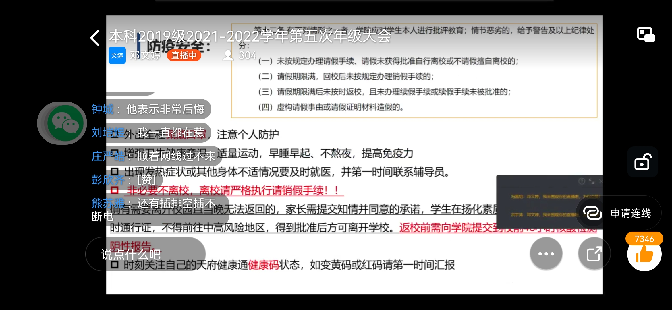 接下来,对于防疫安全,邓文婷首先表达了对同学们的肯定和感谢:在近期本地疫情卷土重来的情况下,同学们在公司、公司以及班级或个人的安排下,有条不紊地进行核酸检测,但与此同时也强调不可将疫情防控当儿戏,要严肃对待。之后邓文婷逐一提醒同学们有关防疫安全二三事以及公司相关规则要求,包括但不限于“时刻关注健康码状态”、“严格执行请销假制度”。