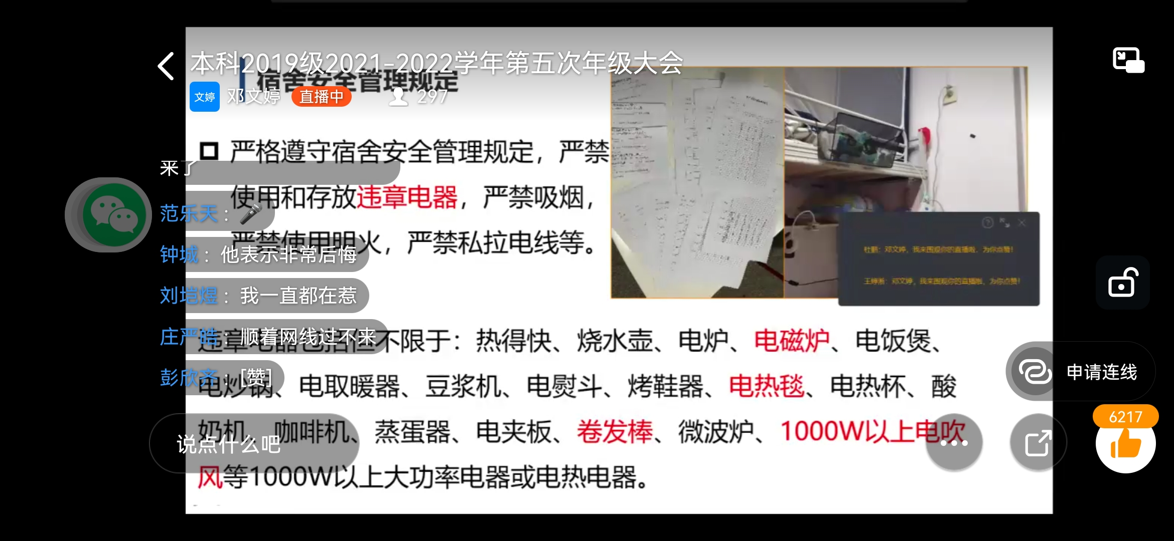 大会在邓文婷对住宿安全条例规定的讲解中拉开序幕。花开两朵,各表一枝。针对校外住宿安全,着重强调同学们要按照既定流程申请,不可私自校外住宿;针对校内宿舍安全,通过列举以往检查同学们的宿舍时出现的一些安全问题,再次提醒同学们注意宿舍用电安全,尤其谨防乱拉电线、使用大功率电器等情况的出现。