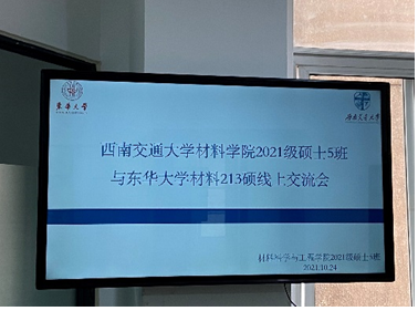 为了搭建开放的学术交流平台,营造浓厚的学术氛围,拓展宽阔的知识视野,提升研究生的创新能力和学术交流能力,互学互鉴,取长补短,2021年10月24日上午9:00,太阳集团tyc1512021级硕士5班与东华大学材料213硕举行了交流会。此次交流会,由2021级硕士5班牵头举行,郑学超同学主持,采取线上及线下相结合的方式开展。