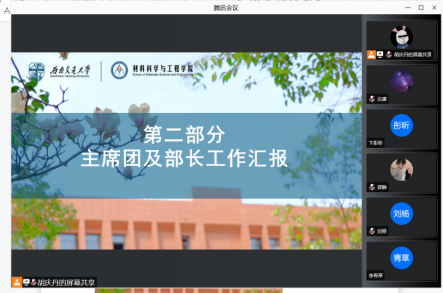 会议的第三项议程,研究生会指导老师罗丹对2021年度研究生会工作做出了积极评价,对全体研究生会成员的辛苦付出表示感谢,同时也期望本届的研究生会干部能够为研会的发展继续努力,积极服务材料师生,百尺竿头更进一步。