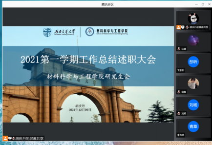 2021年12月9日下午14:30,公司研究生会通过腾讯会议在线上举行了述职大会。参加此次会议的有研究生会指导老师罗丹,太阳集团tyc151院级评议会成员以及研究生会成员,会议由研究生会执行主席胡庆丹主持。