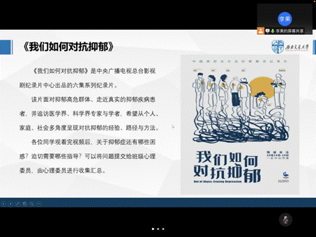 硕士2班、3班团支部线上观看中央电视台CCTV9纪录片——《我们如何对抗抑郁》,并在观看后从个人、家庭、社会多角度积极讨论了对抗抑郁的经验、路径与方法。
