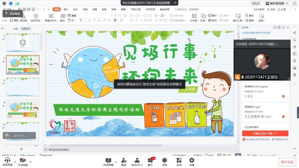 “线上观影”活动中,电影《第11小时》带我们近距离了解人类所生存的地球家园正面临何种困境,我们又应该如何去保护她。观影结束后,同学们都深有感触,对“环保”这一概念有了更深刻的理解。