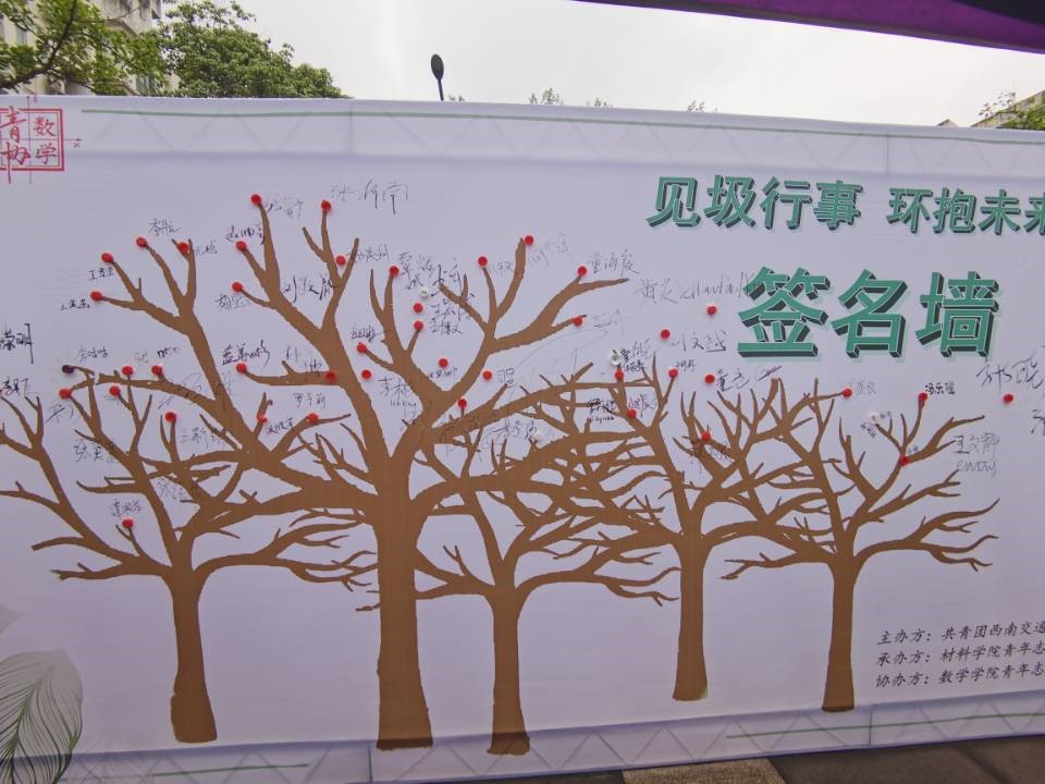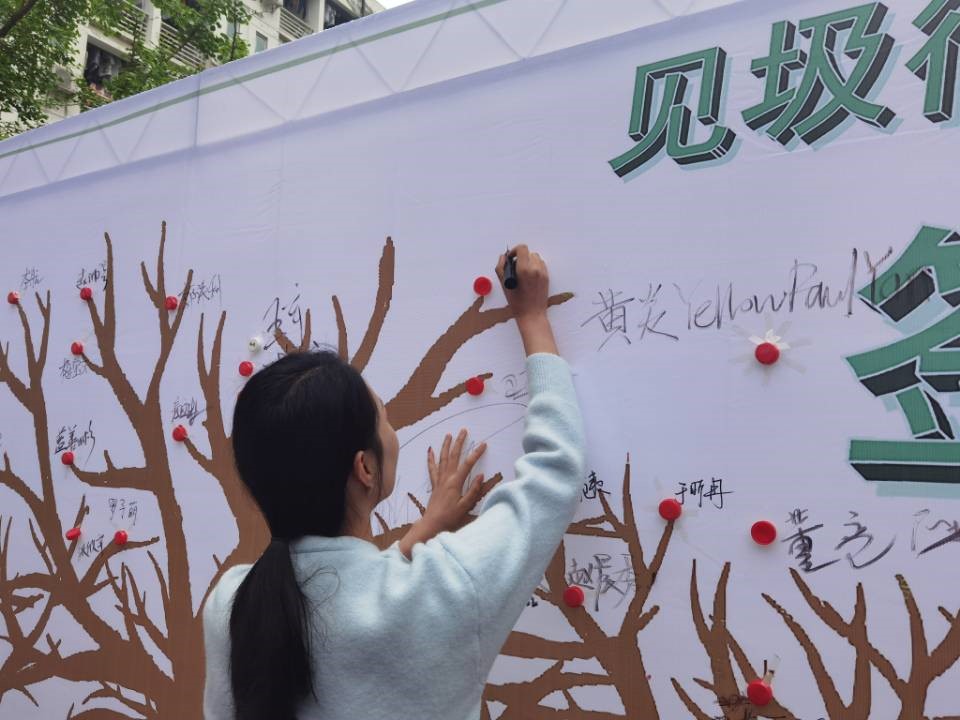 签名墙活动中,同学们在签名墙签上自己的名字后贴上瓶盖,与熟悉的人或陌生人共同谱写出一幅环保蓝图。