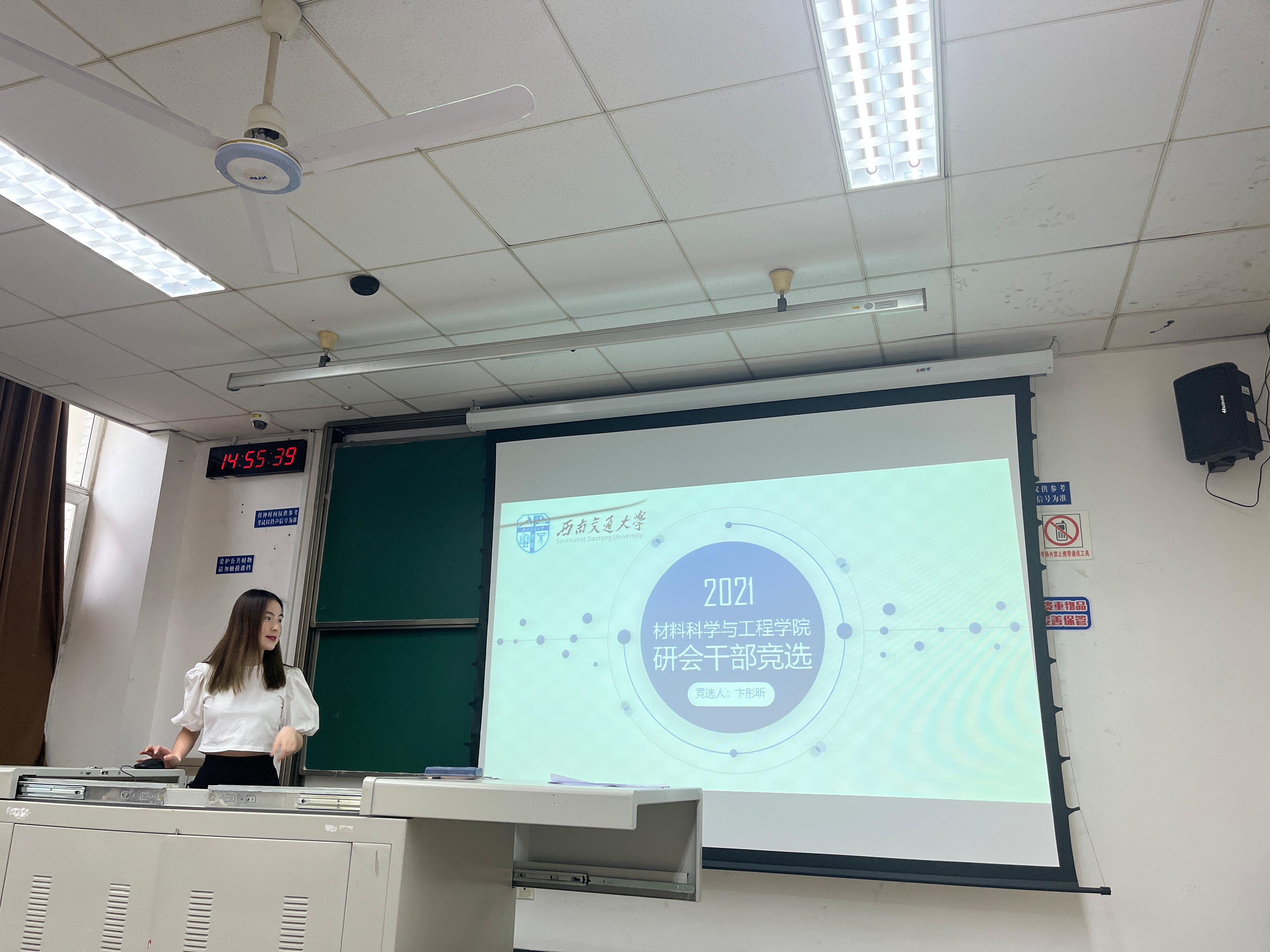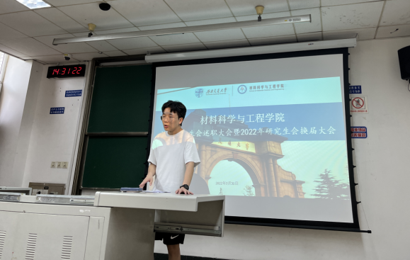 2022年5月31日下午两点半,公司研究生会(以下简称材料研会)述职大会暨换届大会在九里校区逸夫馆4332如期举办。本次大会议程共有主席团代表述职、部长述职、换届竞聘答辩、投票选举、指导老师发言五个部分,由研会执行主席胡庆丹主持,公司研究生会指导老师罗丹、研究生辅导员廖妙威、材料研会全体成员和研究生代表参加。
