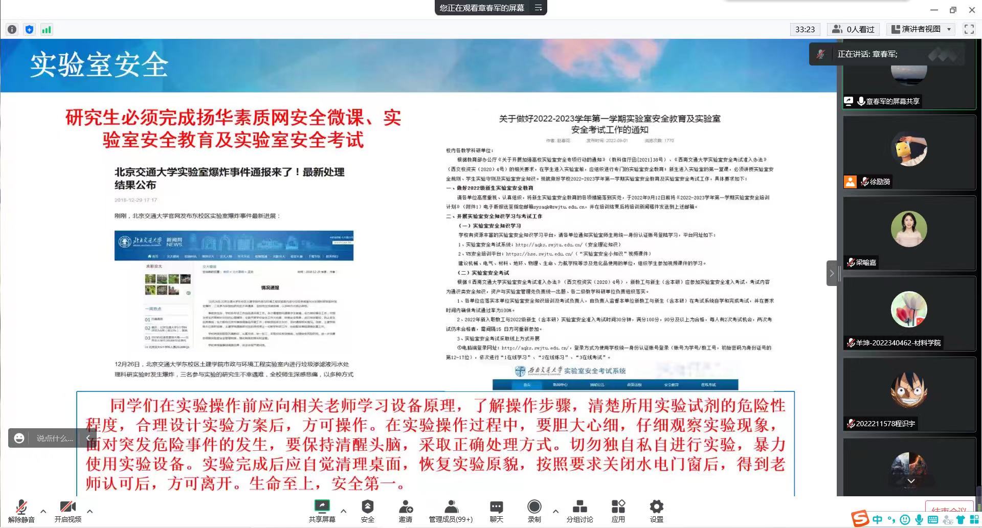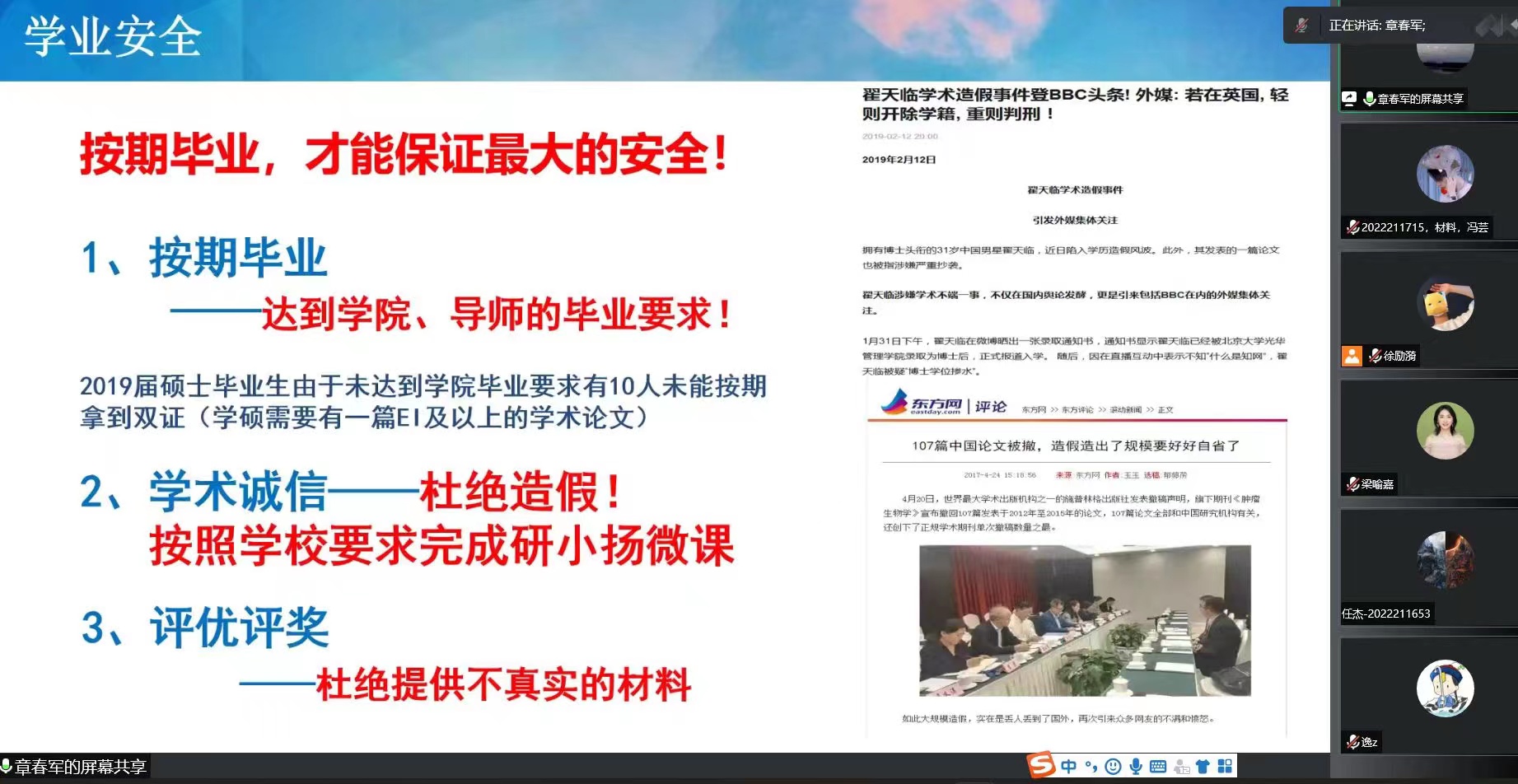 章春军围绕研究生阶段可能面临的主要学业问题和日常安全问题两方面展开,教育内容涵盖学术诚信、实验室安全、疫情防控、心理健康、网络借贷、意识形态安全、宿舍防火及用电安全等重要安全事项。