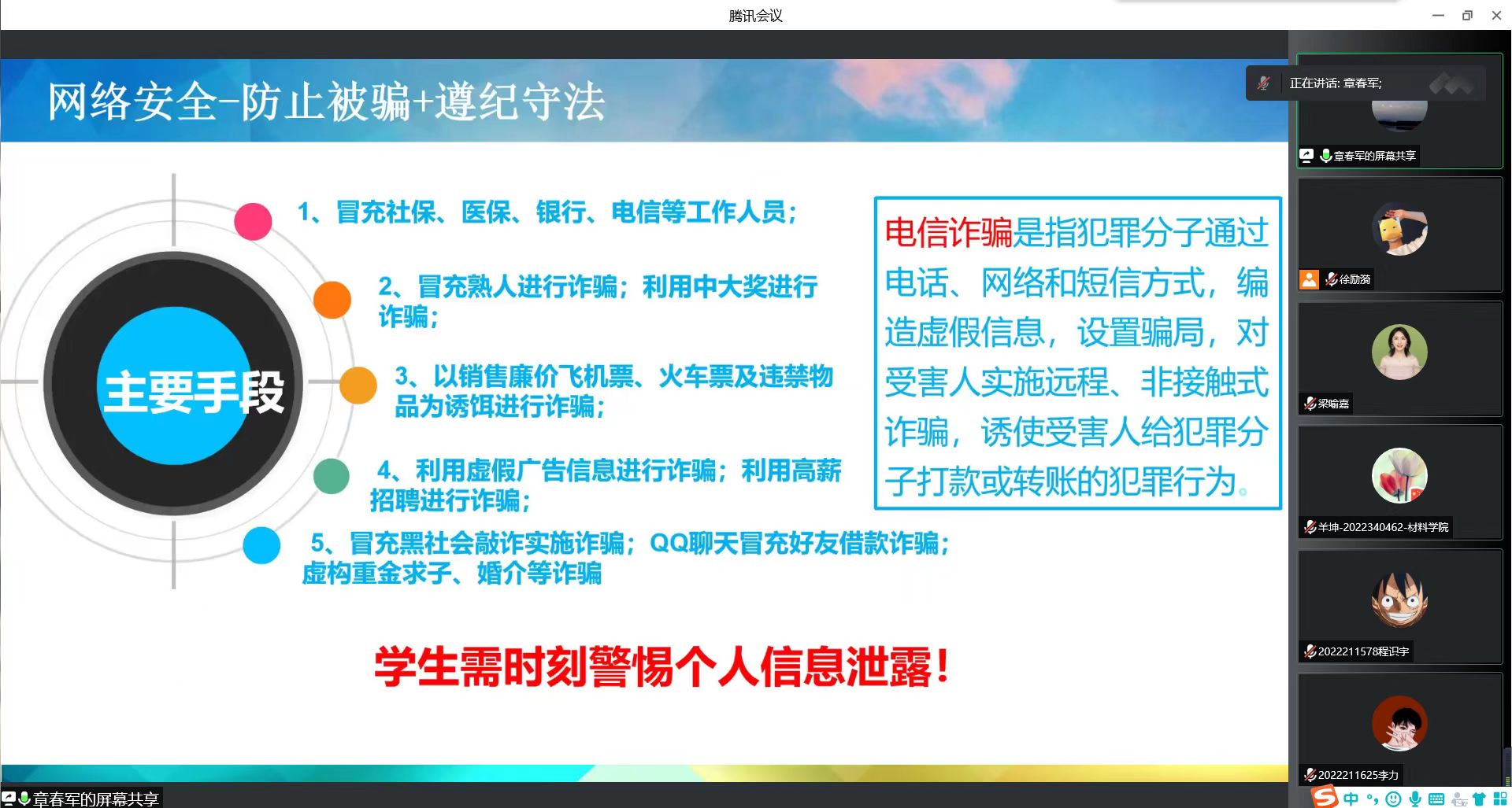 章春军还就电信网络诈骗、宿舍用电安全、校外住宿安全、交通安全、艾滋病防范等问题,与同学们进行了交流,强调了相关重点注意事项。
