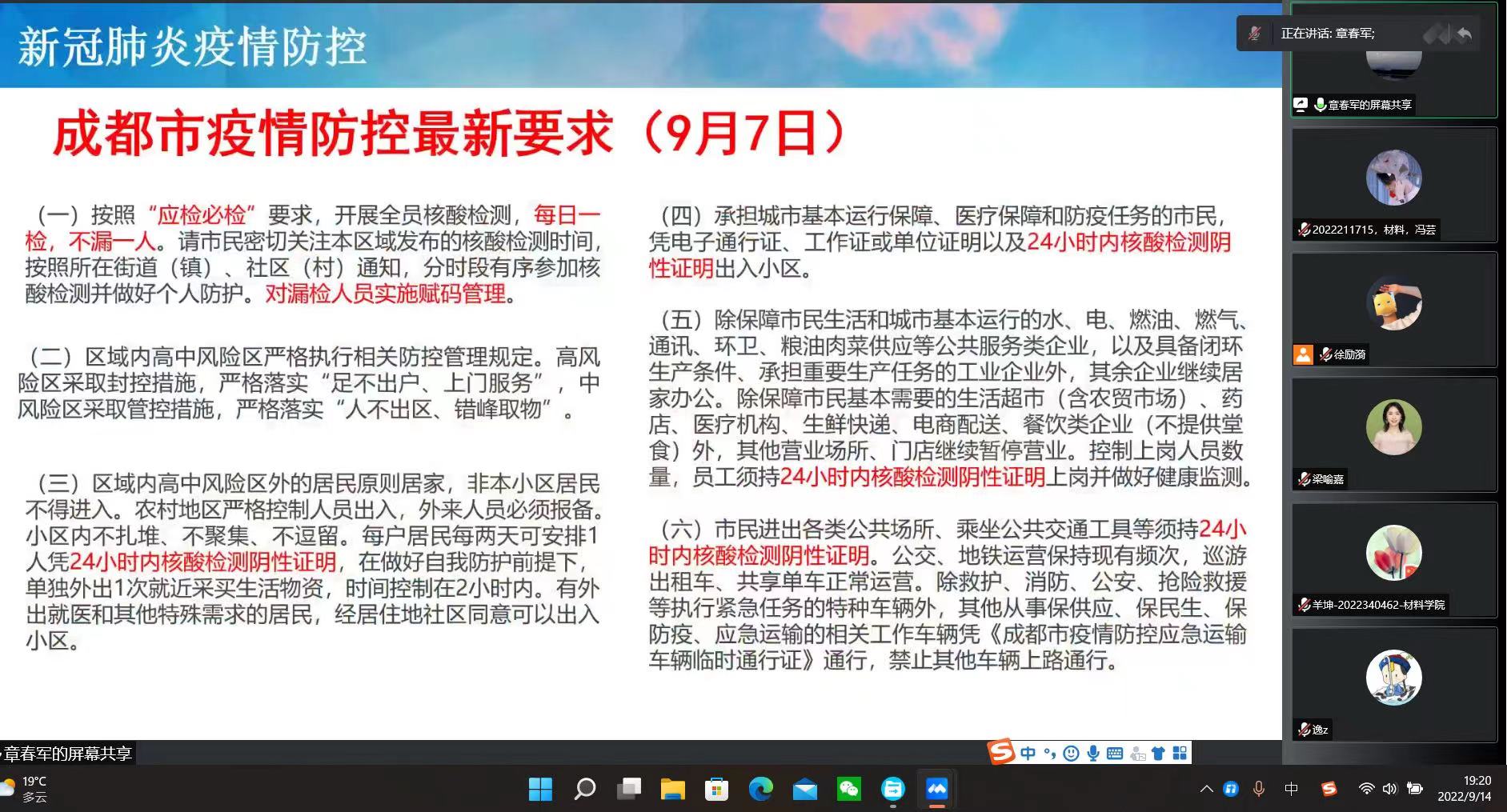 在日常安全方面,章春军首先为同学们讲解了疫情防控的形势、政策和要求,引导同学们树立大局意识、规矩意识和责任意识,严格遵守成都市和公司相关管理规定,积极配合落实防疫工作要求,以健康生活和积极防疫加强自我防范。