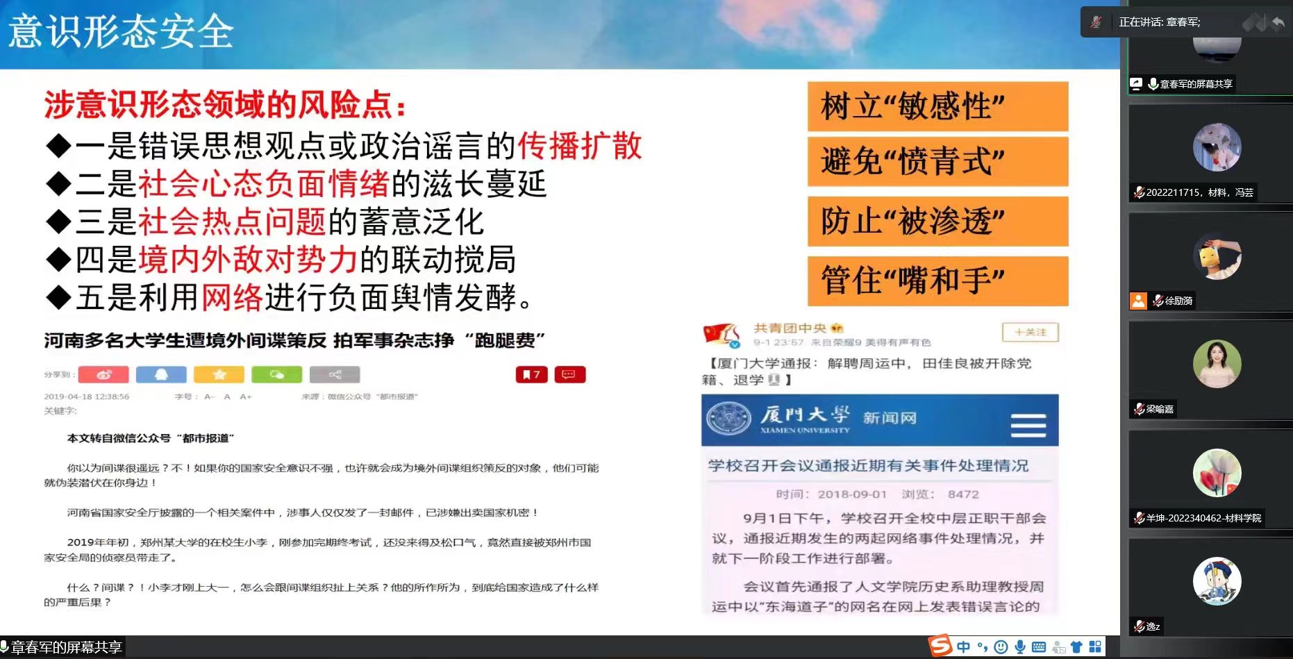 在意识形态与政治安全方面,章春军为同学们分析斗争的复杂形势,要求广大青年爱党爱国爱校,树立“敏感性”,避免“愤青式”,防止“被渗透”,管住“嘴和手”,做中国特色社会主义事业的接班人。