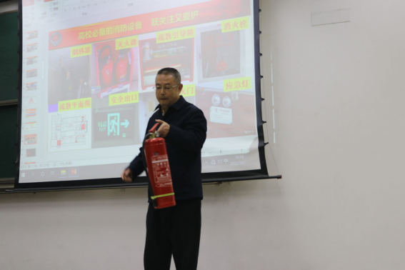 紧接着,李老师介绍了消防器具的类型及使用方法,并且现场演示了干粉灭火器的正确使用方法,以及呼吸器使用时应注意的细节。通过播放视频和现场演示提醒同学们日常使用电器的重要性以及火场逃生技能的重要性。