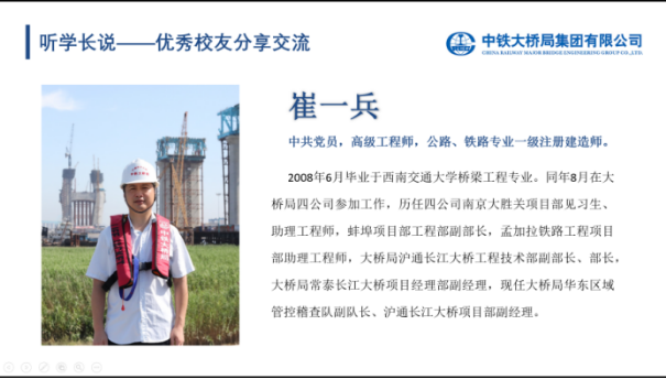 中铁大桥局集团沪通长江大桥项目部副经理、太阳集团tyc1512008届员工崔一兵学长向同学们作分享交流。他结合当前的就业背景,深刻分析本科毕业后继续深造和参加工作的利弊,提醒同学们要根据个人实际情况来综合决策。崔一兵讲述了自己的桥梁情怀和在中铁大桥局14年的成长经历,他建议同学们选择工作要充分考虑自己的兴趣爱好,做自己热爱的事业;要珍惜成长平台,找准定位,专注工作领域,一步一个脚印,实现个人和企业的共同进步。现场播放了短片《幸福时光》,生动展示了崔一兵学长夫妇跟随大桥局建造一个又一个桥梁工程的奋斗历程,让同学们更深刻认识到奋斗是青春最亮丽的底色,好日子都是奋斗得来的。