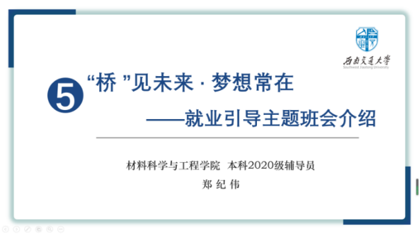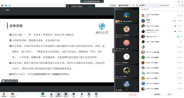 活动最后,公司本科2020级辅导员郑纪伟老师简要介绍了本次“‘桥’见未来·梦想常在”就业指导主题班会活动的总体安排、筹备情况、指导老师配备情况和企业校园大使名单,并展示了由中铁大桥局集团有限公司提供的精美奖品。
