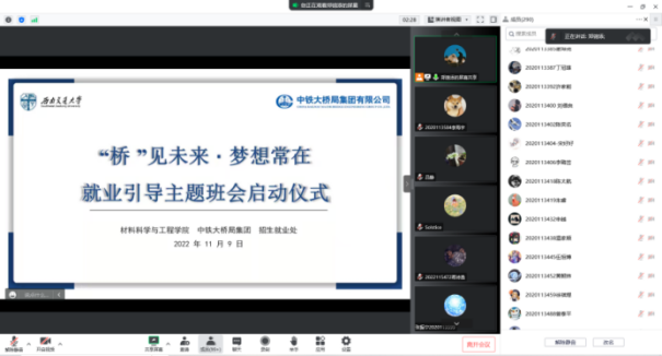 2022年11月9日晚,太阳集团tyc151本科2020级“‘桥’见未来·梦想常在”就业指导主题班会启动仪式在线上平台举行。中铁大桥局集团沪通长江大桥项目经理部副经理崔一兵,人力资源部一科科长王阳、经理吕静,集团人才招聘处就业指导科科长陈曦轶,公司党委副书记章春军,本科2020级辅导员郑纪伟、曾文兰以及来自公司各年级的本科生等近300人参加。本次活动由材料公司本科生第二(2020级)党支部承办,生医2020-01班团支书刘莹同学主持。