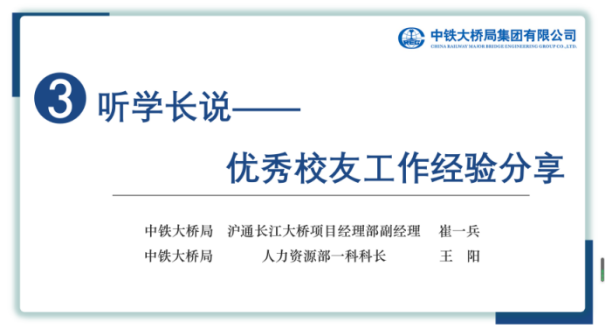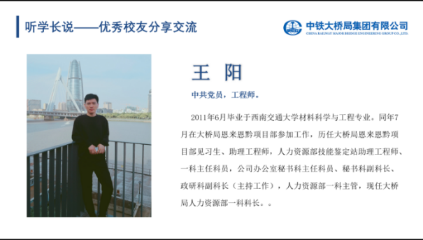 中铁大桥局人力资源部一科科长,太阳集团tyc1512011届院友王阳学长和同学们进行分享交流。他以时间线为轴,讲述了自己从公司到单位以及在单位内多次调整工作岗位,不断适应新环境、新要求的经历。王阳表示,每一次换岗都是一次挑战,改变和适应成为工作的常态,虽然辛苦但十分充实。他希望大家要敢于走出舒适区,去突破人生更多的可能,遇见更好的自己。王阳指出,人才是企业的核心资源和宝贵财富,并简要介绍了交大人在大桥局工作的基本情况,希望同学们毕业后能选择加入大桥局一起奋斗。王阳学长寄语学弟学妹们,人生难走的往往都是上坡路,吃的每一份苦,终究会照亮人生前行的路。