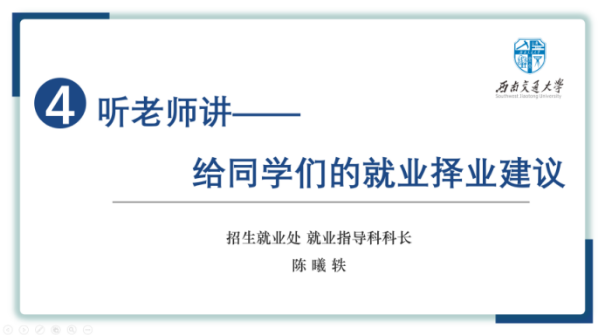 人才招聘处就业指导科科长陈曦轶老师结合自己多年工作经验为同学们提供择业就业建议。她首先肯定了“就业单位人人讲”活动是全校范围内的一个首创,对同学们树立生涯规划意识、就业择业都非常有意义。谈及生涯规划,陈老师为同学们详细解读了“知己、知彼、决策、行动”的指导思想,强调要充分考虑人岗匹配和个人兴趣,全面综合掌握就业信息,并加强在实践中的自我了解。陈老师告诉同学们,以就业为导向进行深入探索,能帮助大家获得更多的选择机会和成长机会,特别要注重学习能力和沟通协作能力的培养。她建议同学们做充分的自我探索,利用各类学习机会做足就业前的准备工作,以便从容面对就业。