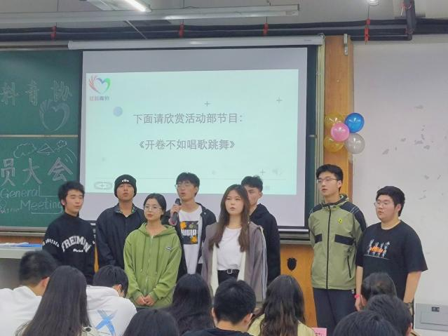 最后登场的部门是活动部,作为协会与校内组织联系对接的纽带,活动部为大家详细讲解“交通•公益”主题活动的相关流程,并分享优秀活动项目成果,鼓励大家积极申报“交通•公益”活动项目,促进个人、班级学思践悟一体化发展。活动部带来的节目是《开卷不如唱歌跳舞》,以一段轻松调侃“内卷”的情景剧作为导入,传递劳逸结合的积极观念,幽默的舞蹈动作让我们也乐在其中,大合唱《倔强》作为结尾,正如各种所唱“最美的愿望一定最疯狂”,让我们握紧彼此,怀揣着坚定的信念共同建设更好的材料青协。