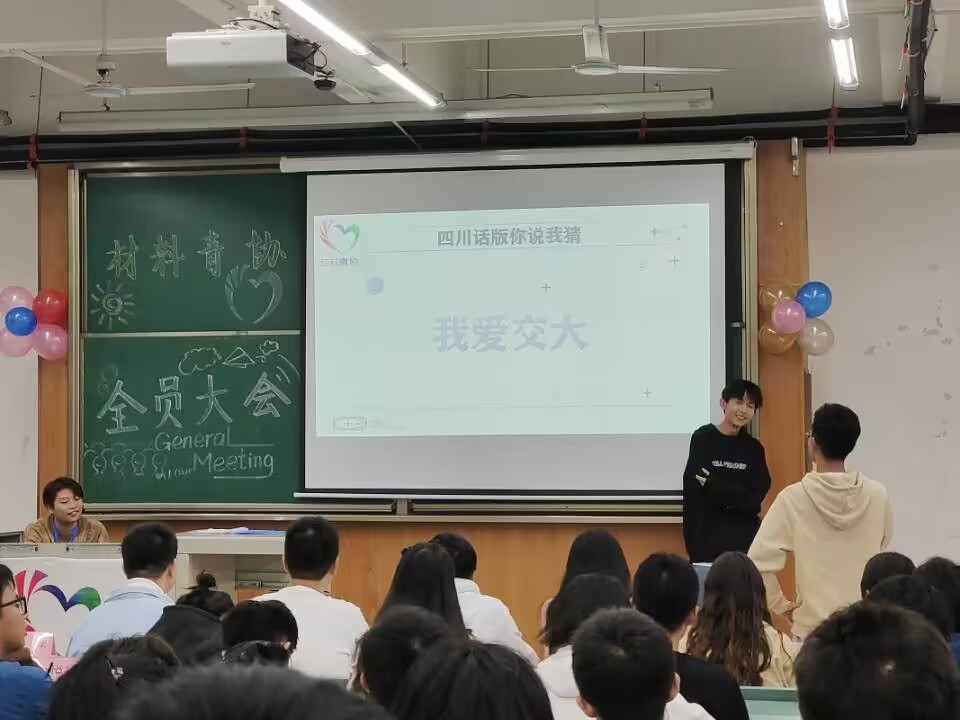 三个精彩节目过后来到让人期待已久的四川话版你说我猜小游戏环节。“和我在成都的街头走一走”“机车博物馆”“材料青协”等特色词句在大家生动的描述中让人更加印象深刻。三轮答题过后,组织部郑文豪和宣传部王艺云以3分钟猜对6个词句的好结果内取得胜利。