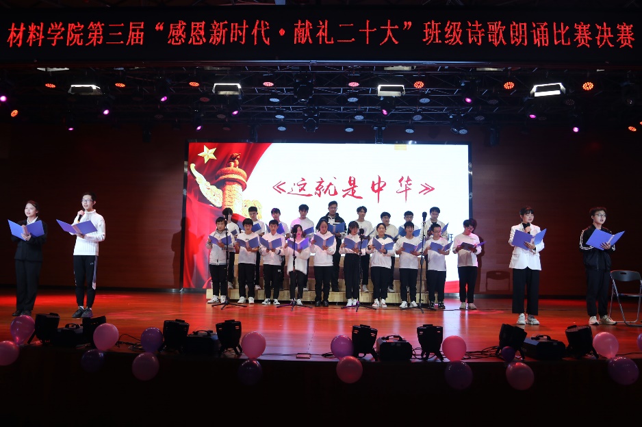 2022级材料5班,他们仿佛能够穿越时空,徐徐书写战火硝烟中《觉醒年代》的奋起与抗争;2021级生医2班歌颂了我们《新时代最可爱的人》,向我们身后默默坚守的人致敬;2020级材料卓越班与甘霖老师带来的原创作品《盛世中国》,澎湃热血的表演带动了全场观众的情绪,将一个灿烂多彩、雄浑壮阔的盛世中国展现在我们面前;2020级金属1班朗诵前的二胡独奏为节目增光添彩,他们用豪迈的声音呐喊——《这就是中华》;2022级材料7班与胡博老师,演绎出《英雄》的一身傲骨,凝聚成中华民族伟大复兴的春潮巨浪……