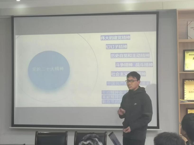 首先,班级团支书赵伟宏为全体同学简要而深刻地介绍了党的二十大精神,并且着重强调了新时代青年当以青春热血在全面建设社会主义现代化国家的火热实践中绽放绚丽之花,要积极承担民族复兴的责任与担当。