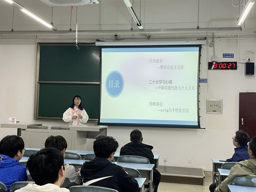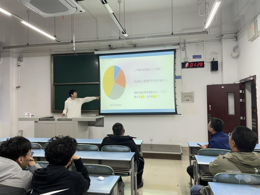 为加强班级学风建设,营造积极向上的学习氛围,学习委员李旭一在收集了全班同学的成绩后进行整理,并在班会上带领全班同学对上学期期末考试情况进行复盘分析与总结,针对班级的现存的弱点提出针对性的建议和改进办法,并已经着手准备实施。在成绩总结的最后,他在PPT上写下一段令人心潮澎湃的话语,勉励同学们在未来继续努力奋进。