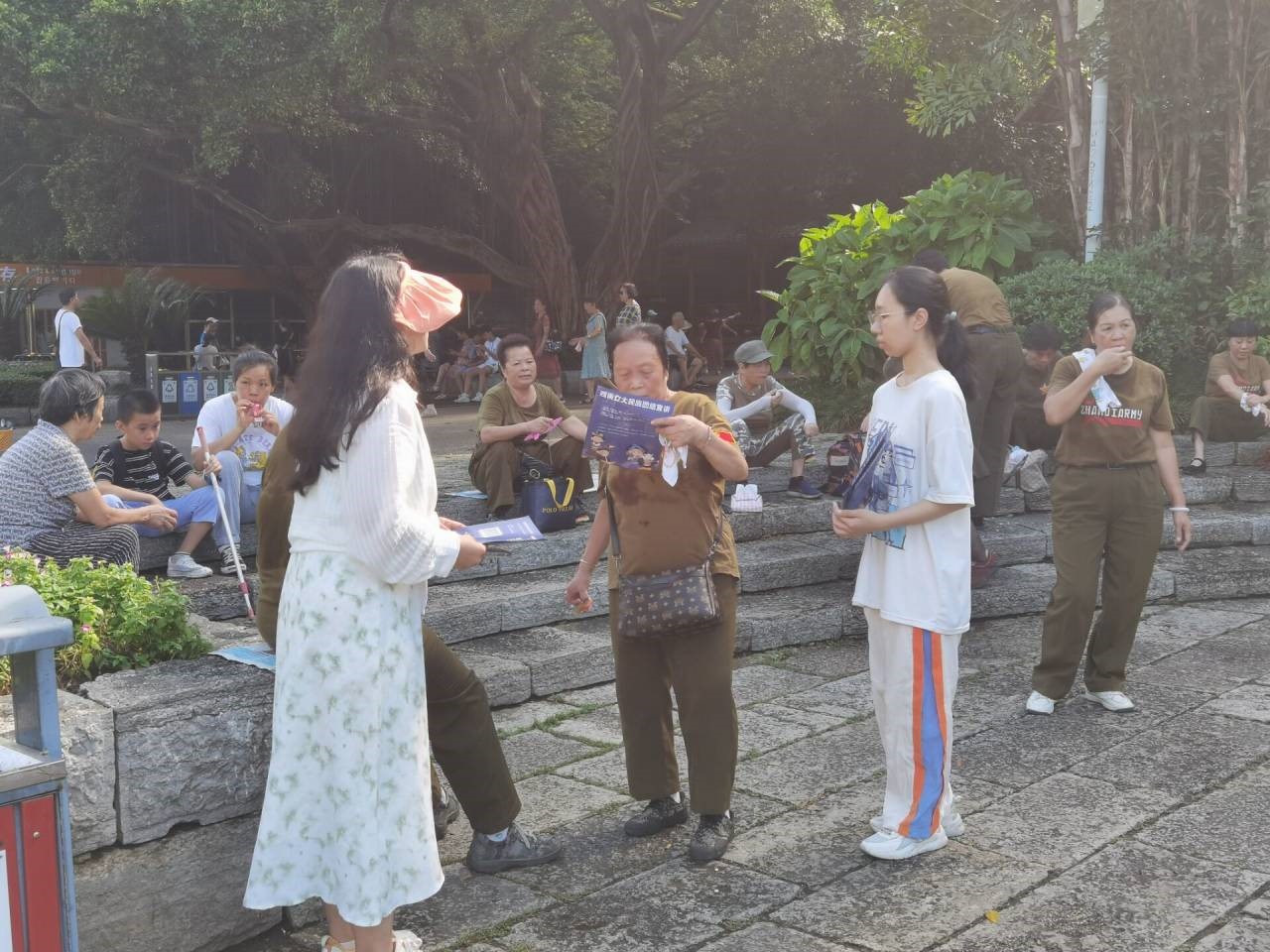 线下宣讲当天,实践队队员奔走在公园各处,为来往的游客发放民族知识问卷的传单,以宣讲的形式为游客普及有关各民族的相关习俗以及历史文化,增强人民群众对民族文化的认知和理解。宣讲活动现场,队员们以问卷调查和活动宣讲的方式充分了解了游客们对民族团结知识的认知程度,以故事的形式开展宣讲,吸引了各个年龄段的游客驻足。其中,队员们还带着小朋友们一起歌唱《五十六个民族五十六枝花》,引起一阵好评。