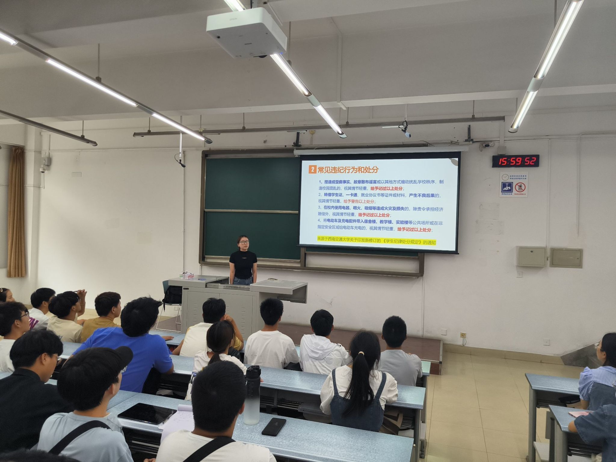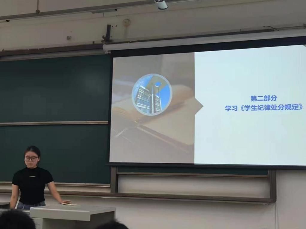 第二部分,辅导员熊心怡带领同学们学习《员工纪律处分规定》,主要从处分种类、高校常见员工违纪行为及相关处分案例为大家讲解,叮嘱同学们严格要求自己,切勿违规违纪。