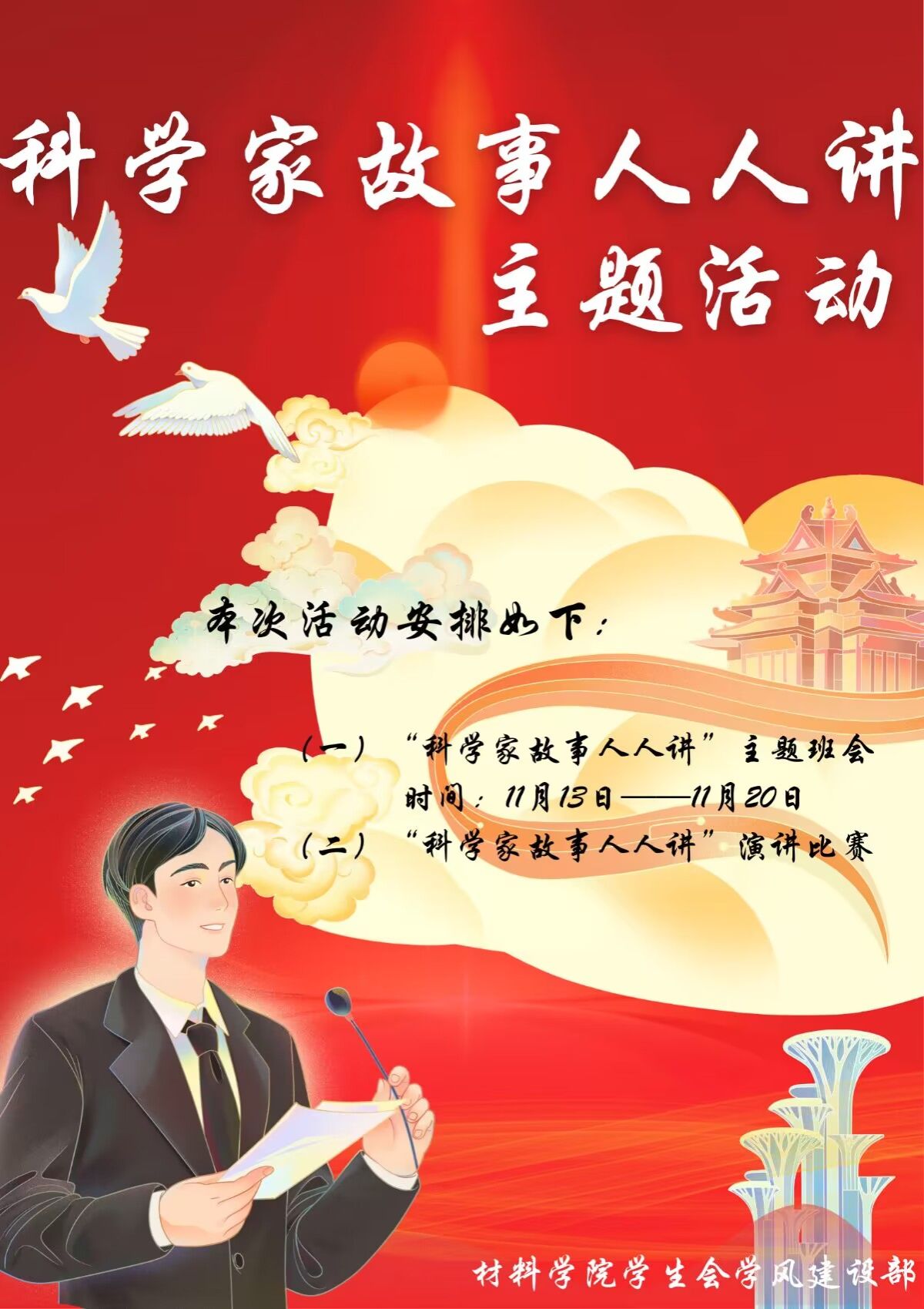 以班级为单位自行组织开展“科学家故事人人讲”主题班会,要求各班级全员参与、线下开展,脱稿演讲(可使用PPT辅助,每页不超过20个字),每人限时3-4分钟。每个班级推选3名表现优异的同学参加全年级评比活动。班内比赛规则、评分办法、评委人选自定,活动时间地点等须提前一天告知班导师、辅导员老师、驻班党员。