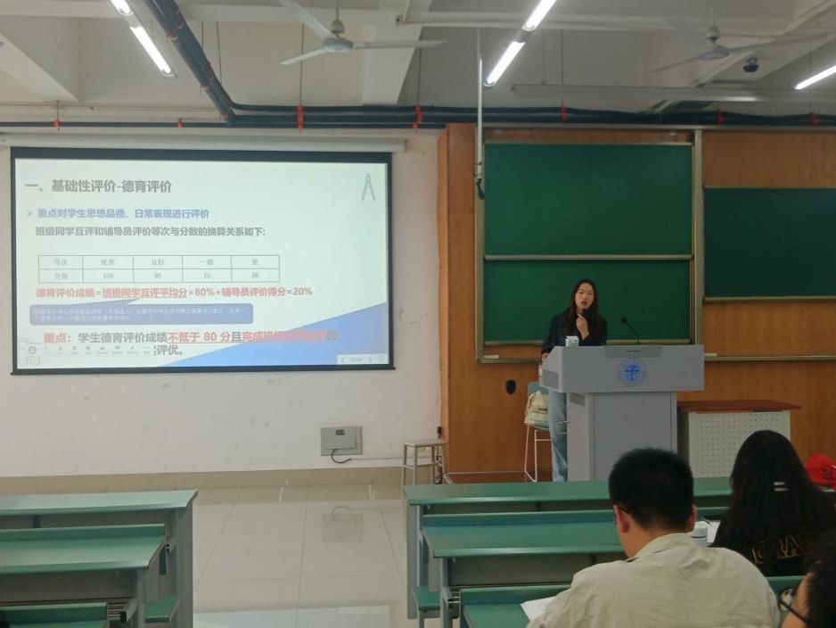 第三部分,年级助理向思林学姐带领同学们学习《太阳集团tyc151本科生综合素质评价办法》。综合成绩由基础性评价和发展性评价构成,其中基础性评价包括德育评价、智育评价、体育评价、美育评价和劳育评价,发展性评价包含员工干部加分、科创竞赛加分等。综合素质评价排名关乎评奖评优,向思林学姐鼓励大家努力学习,认真做好学业规划,以优异的成绩来为自己的老员工活争光添彩。