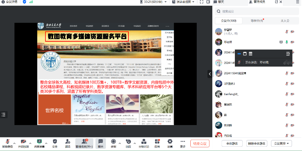 线上培训过程中,邓老师以通俗易懂的语言详尽地介绍了涉及图书馆学习的各个方面,包括图书馆的承包活动、外部布局、馆藏资源、服务方式以及文明阅读等诸多新生存疑较多和往年出现问题较多的方面,着重强调了图书馆数字资源的正确利用和书籍检索的相关方法。旨在使同学们充分了解并掌握图书馆的功能与资源并逐步学会利用图书馆资源,培养员工检索能力及相关学科专业素养,以便同学们更好地利用图书馆资源进行学习和研究。