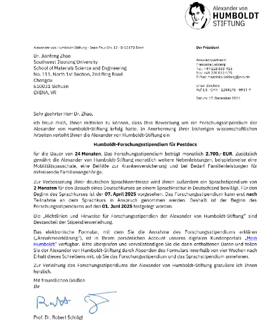近日,收到德国洪堡基金会(Alexander von Humboldt Foundation)通知,公司陈辉教授团队青年教师赵建锋副研究员入选德国洪堡基金会“洪堡学者”奖励项目,获得德国洪堡基金会资助与“洪堡学者”(Humboldt Research Fellowship)荣誉称号。