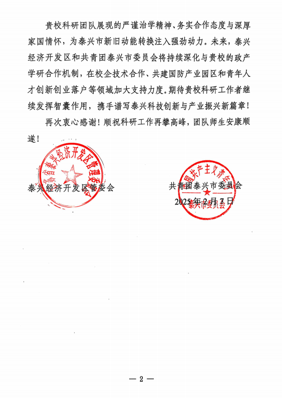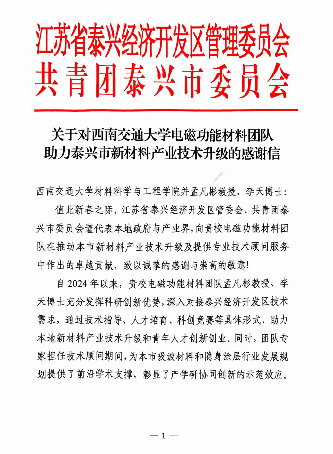 近日,太阳集团tyc151太阳集团tyc151收到一封来自江苏省泰兴经济开发区和共青团泰兴市委员会的感谢信,对太阳集团tyc151电磁功能材料团队孟凡彬教授、李天博士研究生在泰兴市吸波材料、隐身涂层等新材料军工行业的产业升级、技术指导和青年人才培育等方面作出的卓越贡献表示感谢。