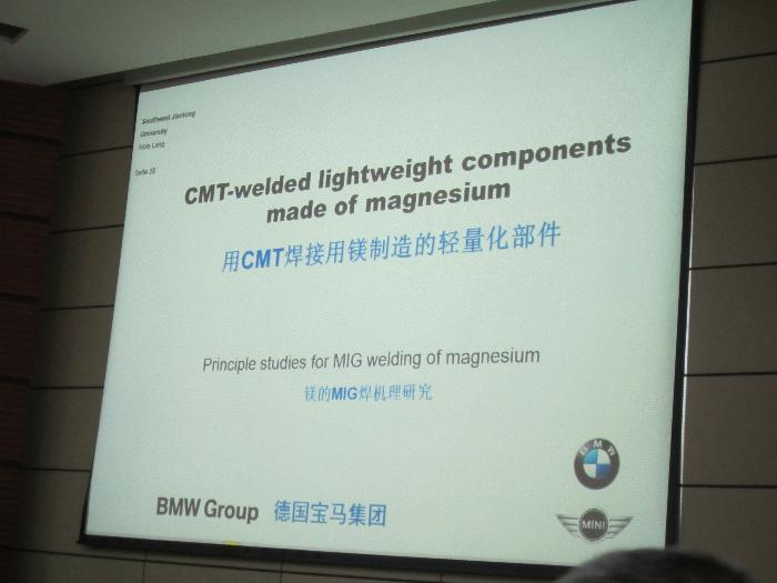 首先,Alois M. Lang先生进行了两场演讲:1、《德国宝马汽车公司1和3系列铝合金车轴架的自动化生产》围绕德国宝马汽车公司轻量化概念,前车轴架的技术数据,铝合金材料,前车轴架加工链,特殊清理概念,板件及其外形,板件的机器人焊接系统,焊接工艺设计,MIG焊工艺,扁焊丝高性能焊接工艺,焊接位置和焊枪角度,车轴架焊接装备,焊缝自动化检测,对挤压件喷射清洗的机器人操作,车轴架的激光检测,冲压机和焊缝质量自动化检测等内容进行了详细介绍。2、《用CMT焊接用镁制造的轻量化部件》从镁与镁合金的冶金性能,MIG焊焊丝,冷金属过渡(CMT) MIG电弧,影响焊接质量的其他因素,生产线的加工链,镁的焊缝质量等方面介绍了镁的MIG焊机理研究。