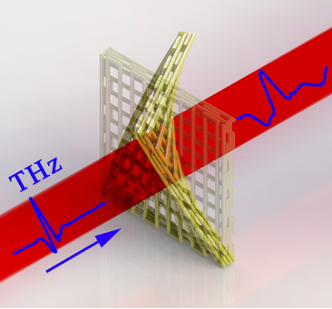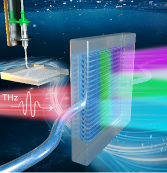 利用相变材料二氧化钒(VO2)与PDMS复合,3D打印出VO2/PDMS三维太赫兹光子晶体;在受到外界热场刺激达到相变临界温度时(~ 68 oC)时,VO2能够在皮秒量级迅速发生绝缘-金属相转变,其介电常数、反射率和电导率等物理性质随之发生数量级的巨大变化,在不改变其结构参数情况下,VO2/PDMS三维太赫兹光子晶体产生可逆的热场响应太赫兹性能。通过在三维微流体器件中导入具有不同介电常数、反射率和电导率等物理性质的填充流体,实现对三维太赫兹波光子晶体太赫兹性能的实时原位调控,简化了三维金属太赫兹光子晶体制备方法,还可以应用于实时无损生物、化学反应太赫兹探测。与通过改变结构参数来调控太赫兹光子晶体性能方式相比,这些无需结构改变就可以实时调控太赫兹相应性能的三维太赫兹光子晶体更容易与其它太赫兹器件实现集成,有望应用于太赫兹前沿技术领域。