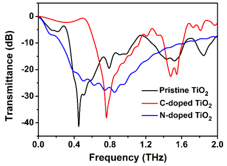 图1 碳、氮非金属离子掺杂TiO2三维太赫兹光子晶体后其太赫兹响应性能的改变。