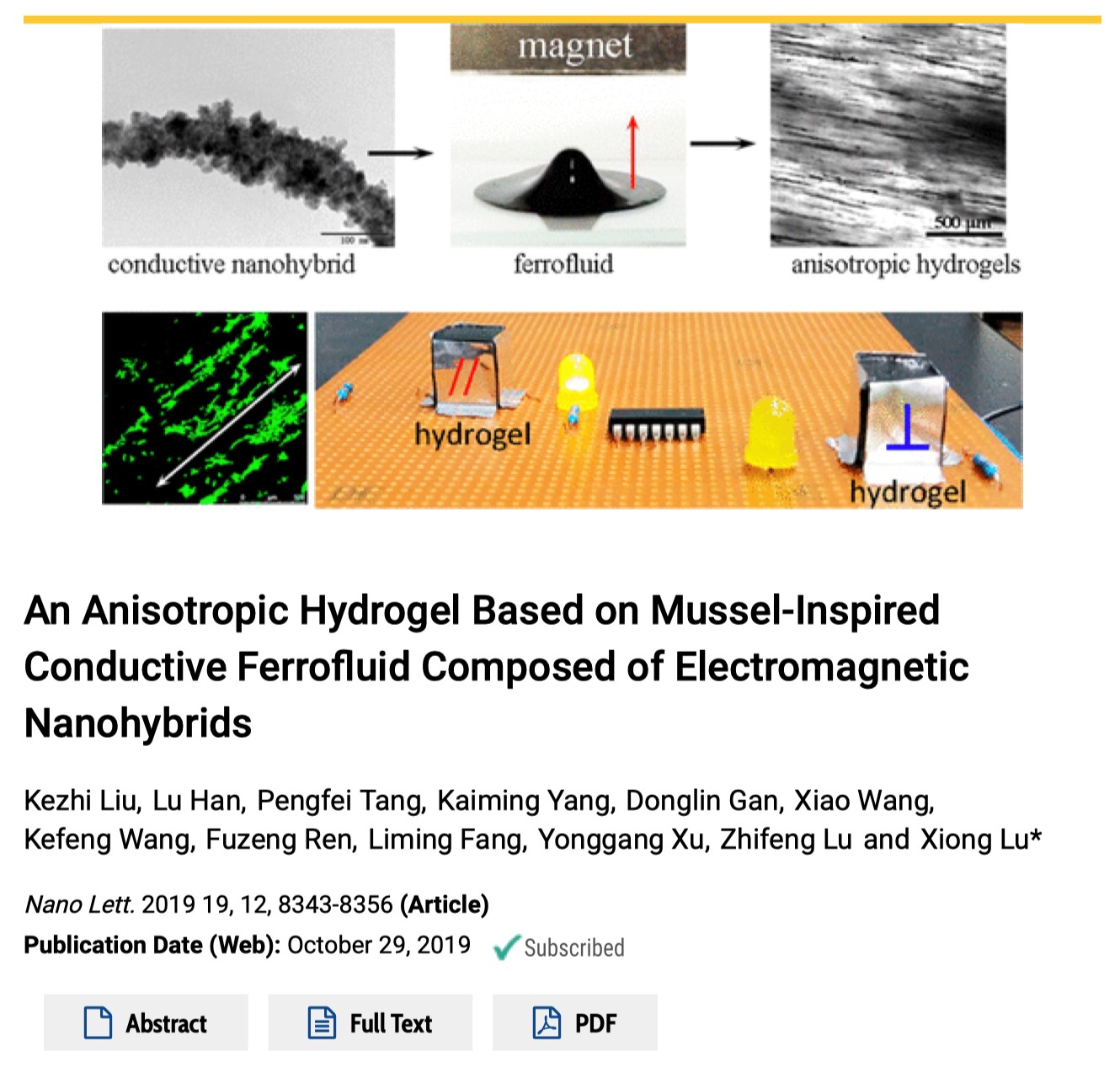 近日,太阳集团tyc151鲁雄教授为通讯作者,刘科志和韩璐博士为共同第一作者,在美国化学会旗下著名学术期刊Nano Letters(影响因子12.279)上发表的论文An anisotropic hydrogel based on mussel-inspired conductive ferrofluid composed of electromagnetic nanohybrids入选“ Top 20 most downloaded articles”。