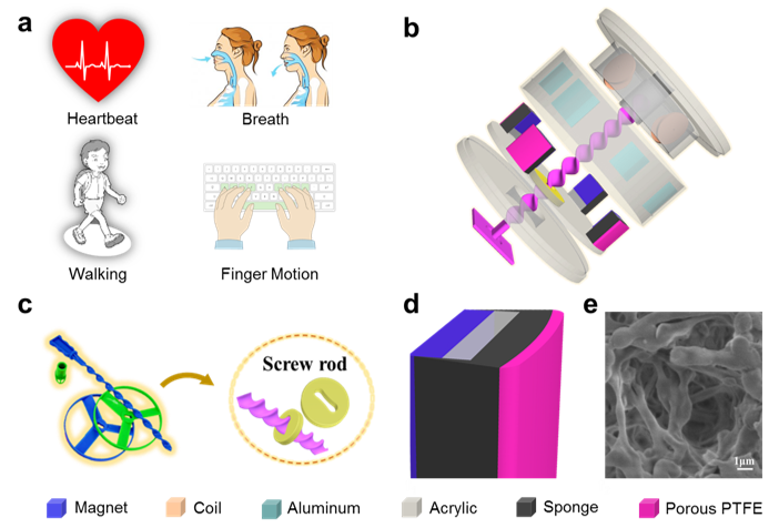 高效的能量收集设备吸引了广泛的研究目光,旨在在可预见的将来为分布式电子设备、个性化医疗保健和人工智能提供可持续且普及的能量解决方案。与传统的电源设备(例如电池)相比,具有可持续和可再生特性的人体机械式能量采集器已被越来越多地视为物联网时代分布式电子设备的理想能源解决方案。在过去的几十年中,以压电、电磁和摩擦电效应为基础的各种能源技术被出色地应用到了将环境机械能转化为电能的过程中。其中最有效的两种方法是:基于法拉第电磁感应定律的电磁发电机(EMG)和根据麦克斯韦位移电流推导的摩擦纳米发电机(TENG)。一方面,人体侧的大部分机械运动都在低频范围内,且与人体相关的生物力学运动通常是线性运动,这对EMG和TENG进行高效机械能收集都构成了挑战。另一方面,由于TENG和EMG固有的工作原理,他们都更适用于转换旋转运动进而产生电能。因此,如何通过TENG和EMG实现低频线性生物力学运动能量的有效转换,仍然是个挑战。