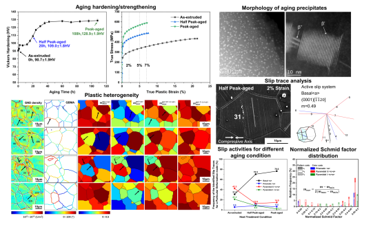 图片摘要:时效硬化/强化,析出相分布及形貌,GND密度与晶粒取向差之间的关系,滑移迹线分析示例及结果