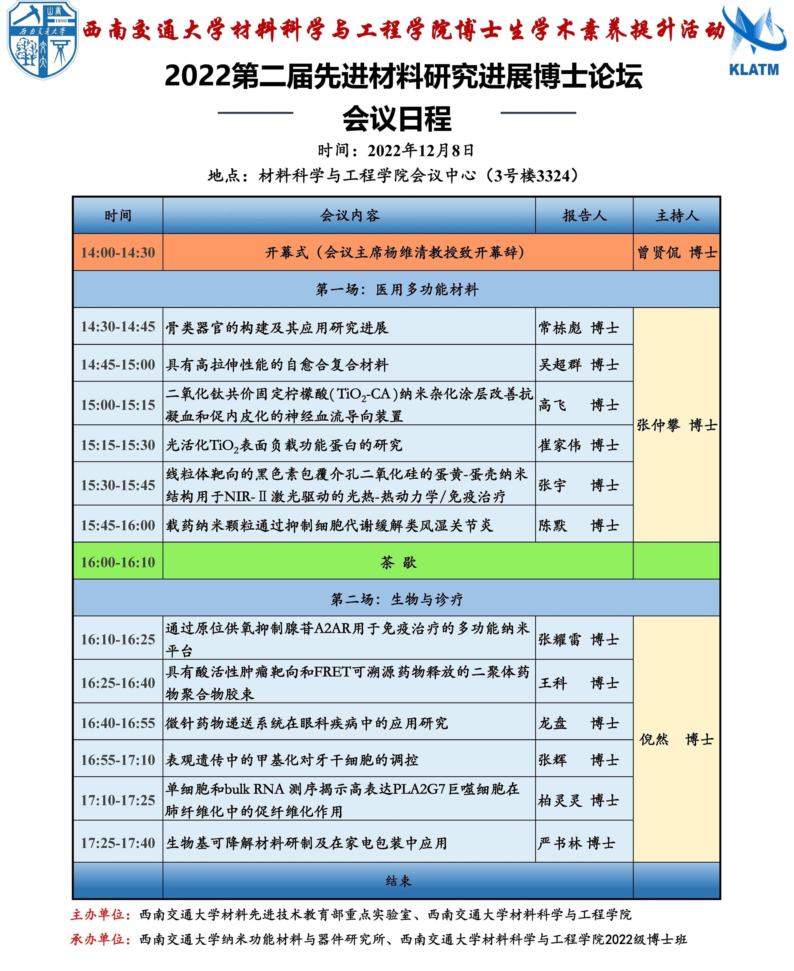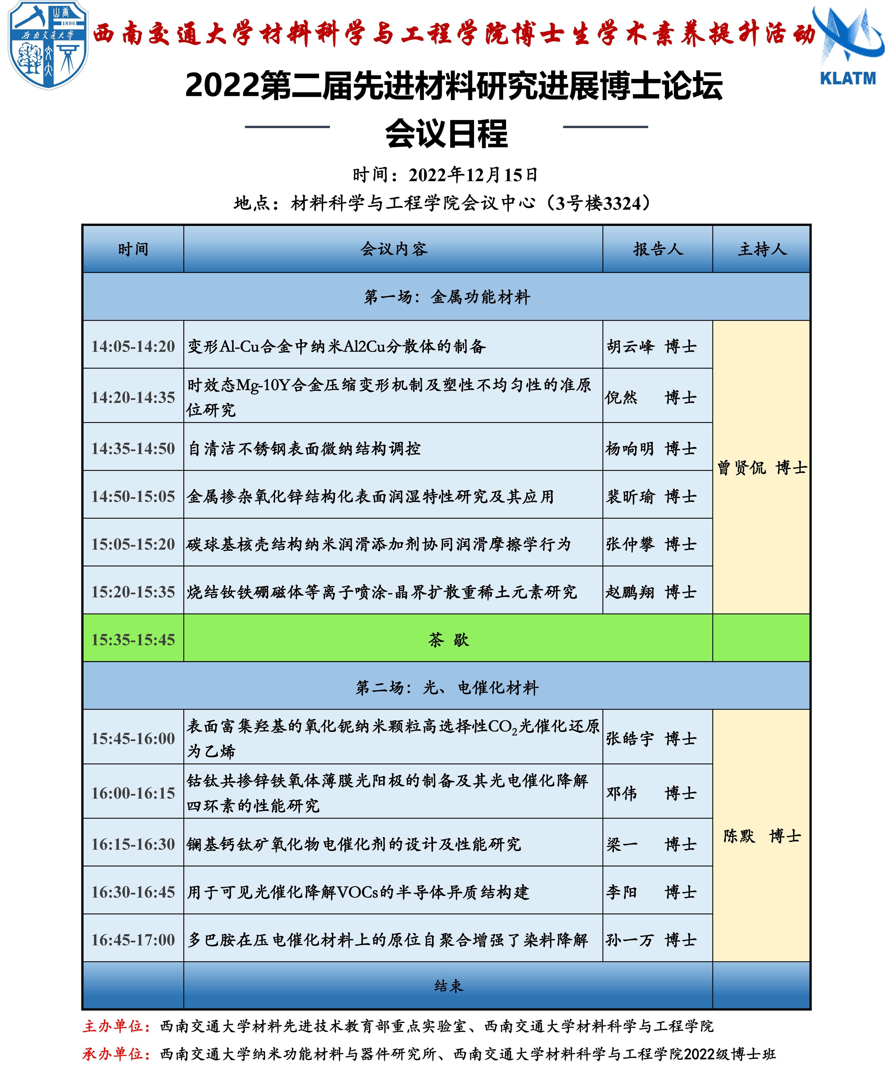 由太阳集团tyc151材料先进技术教育部重点实验室、太阳集团tyc151主办,太阳集团tyc151纳米功能材料与器件研究所、太阳集团tyc1512022级博士班共同承办的“太阳集团tyc151博士生学术素养提升活动——2022第二届先进材料研究进展博士论坛”将于2022年12月08日、2022年12月15日、2022年12月22日在太阳集团tyc151会议中心(3号楼3324)召开。会议邀请了太阳集团tyc1512022级博士研究生进行主题报告,报告将围绕医用多功能材料,生物与诊疗,金属功能材料,光、电催化材料,能源及薄膜材料,凝胶材料及传感器多方面的学科前沿交叉问题展开,旨在促进材料科学学科发展、合作与创新,激发思想碰撞和产学研合作,拓宽公司博士研究生的学术视野,提升公司博士研究生的创新能力和学术素养,搭建良好的学术交流平台。诚心期待各位专家学者前来,共同进行学术交流研讨。